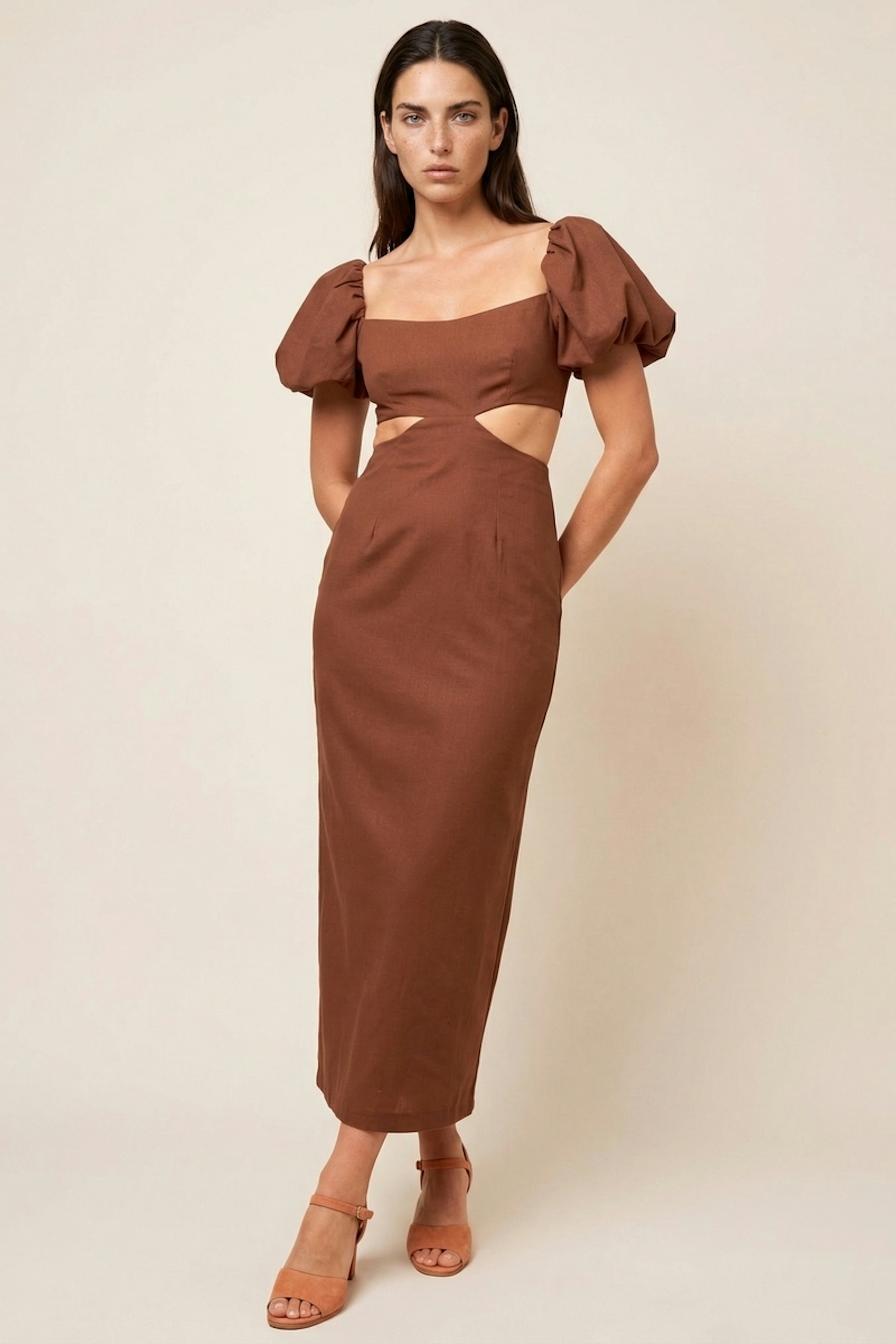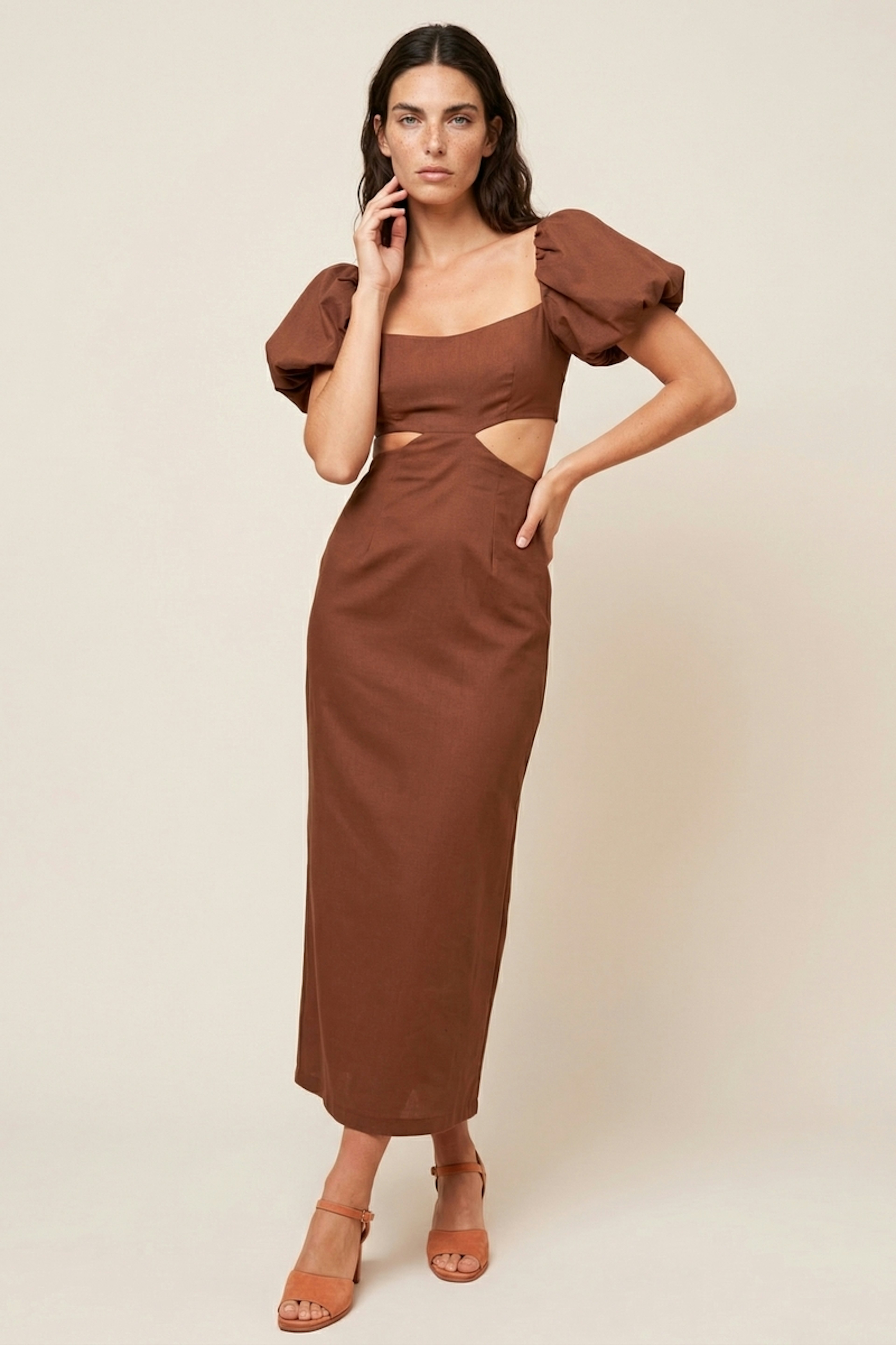 Pour un look raffiné, associez cette robe avec des sandales dorées et un sac à main en raphia. Parfaite pour les journées estivales décontractées. • Robe courte et évasée • Manches bouffantes • Découpe à la taille • Encolure carrée • Couleur marron élégante