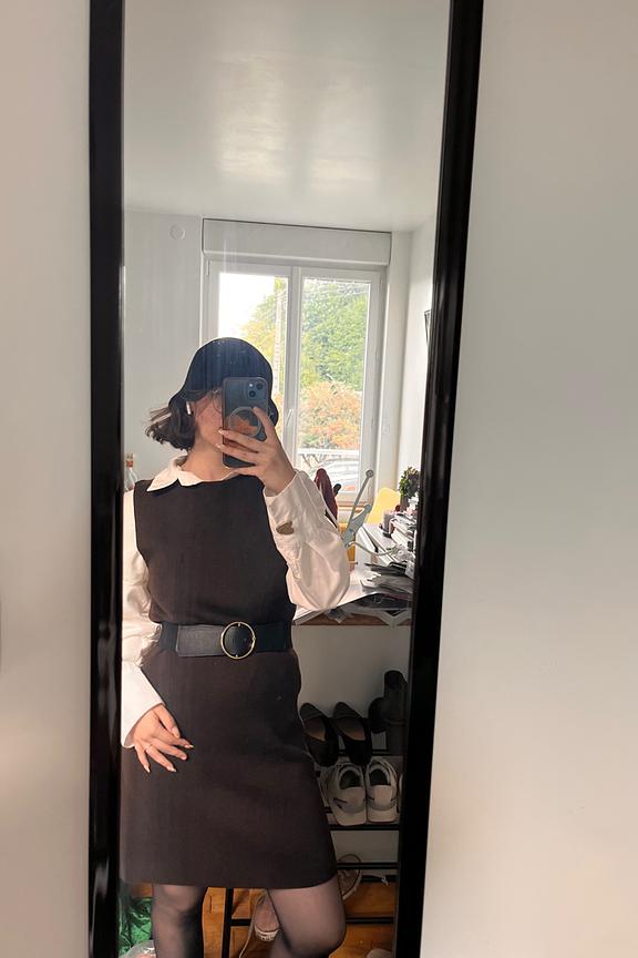 Associez cette robe avec des mocassins élégants et un sac structuré pour un look chic et moderne. Parfait en toute saison. • Robe courte • Coupe droite • Sans manches • Col rond • Couleur marron