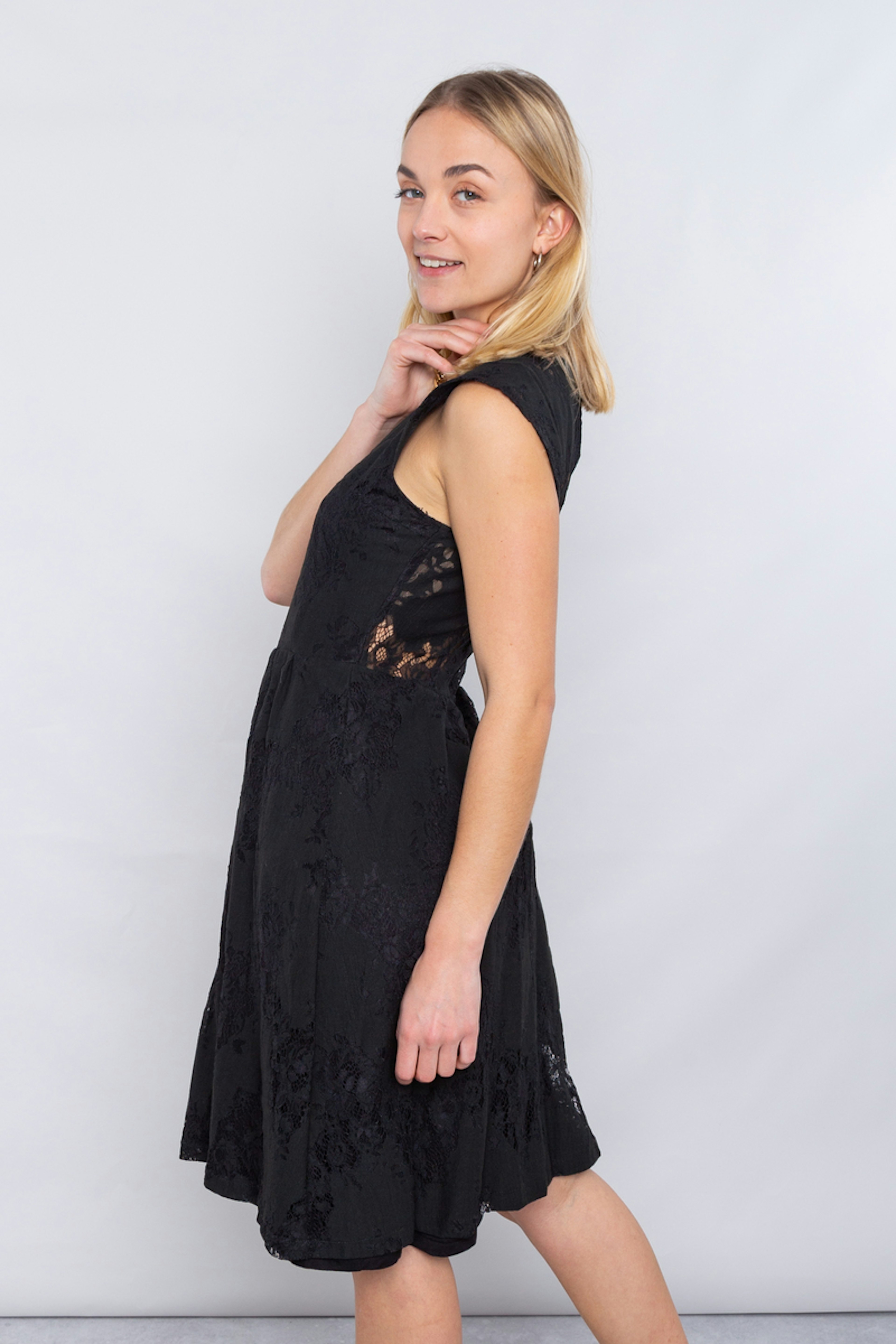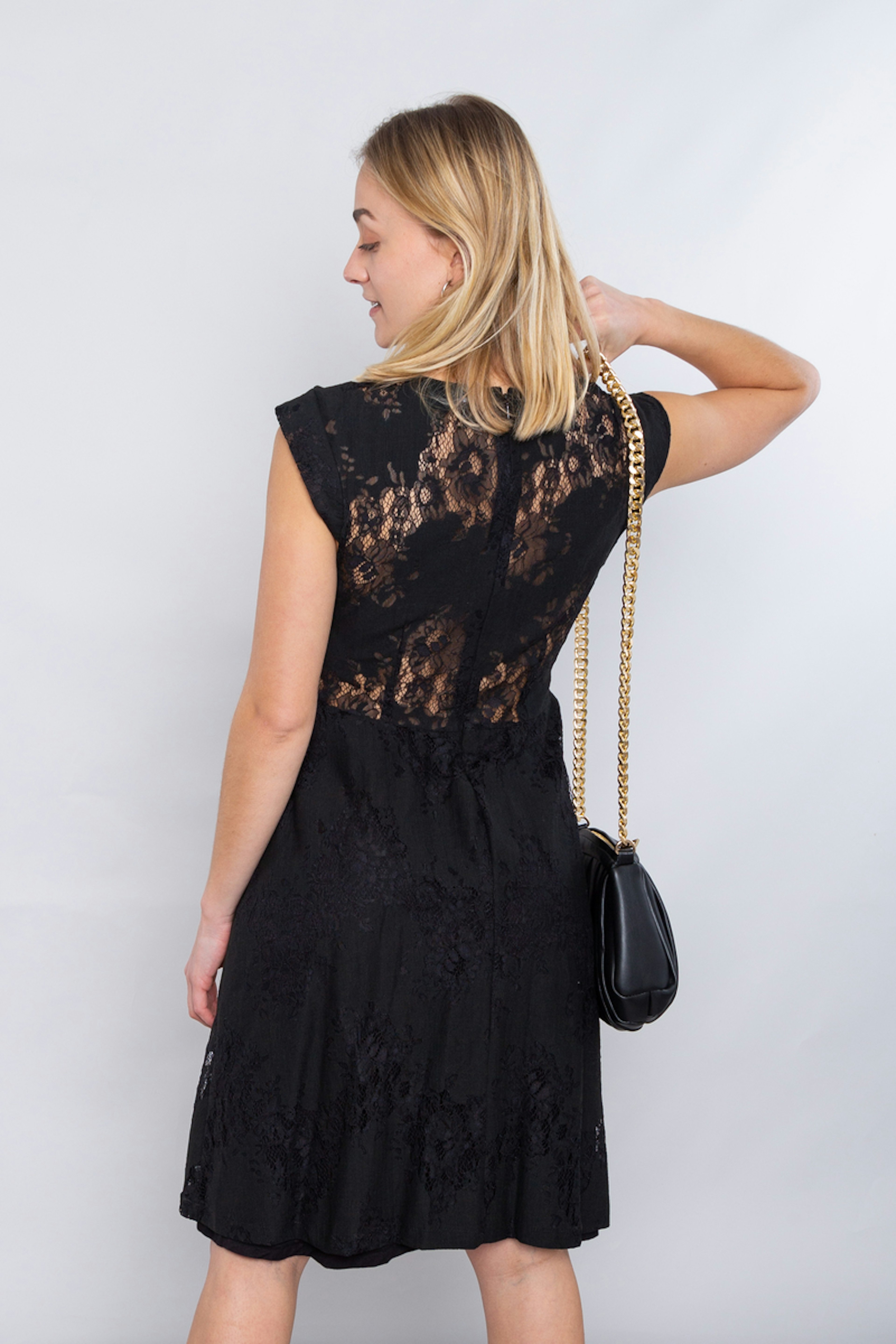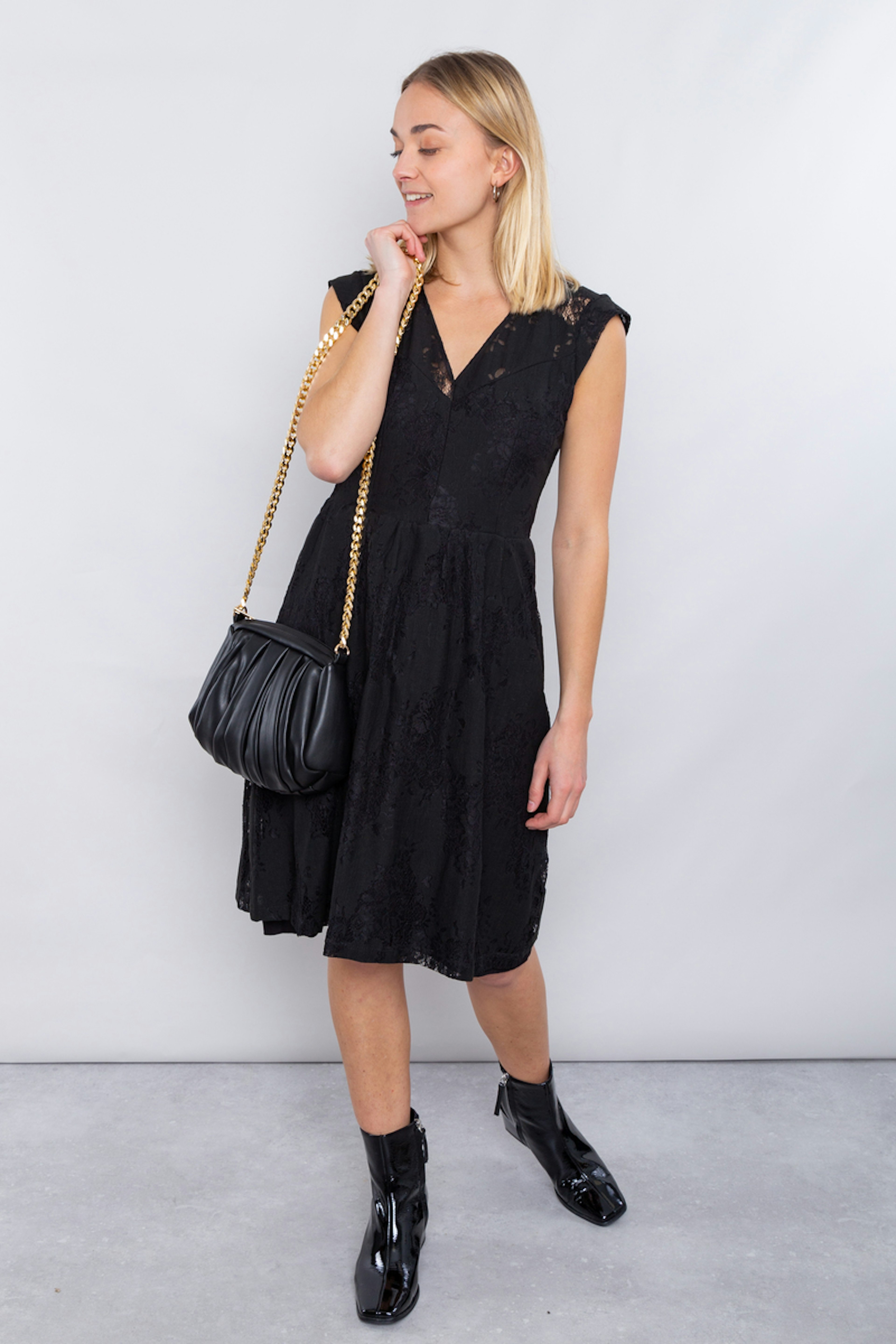 โข Robe en fine dentelle noire โข Cintrรฉe ร la taille โข Plis sur le devant โข Mancherons โข Encolure en v โข Doublure intรฉgrรฉe โข Zip milieu dos