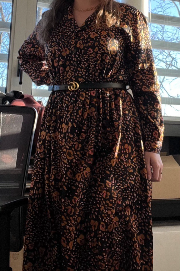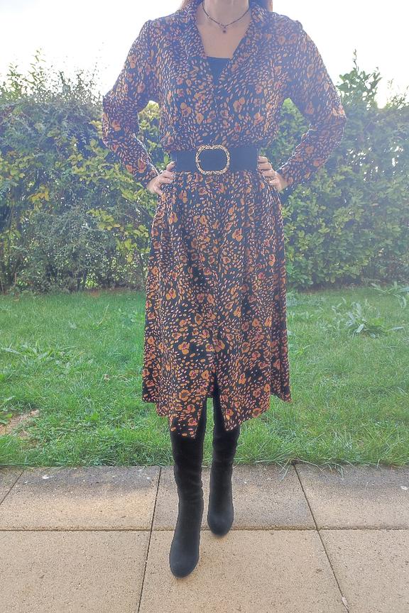 Optez pour cette robe chic et audacieuse avec des bottines en cuir et un manteau en laine pour un look รฉlรฉgant et chaleureux cet hiver. โ€ข Robe longue et รฉvasรฉe bleu marine et orangรฉ โ€ข Imprimรฉ mi-floral, mi-lรฉopard โ€ข Manches longues โ€ข Boutons ร  enfiler sur toute la devanture โ€ข Encolure plongeante ร  revers crantรฉ โ€ข Ceinture amovible ร  la taille