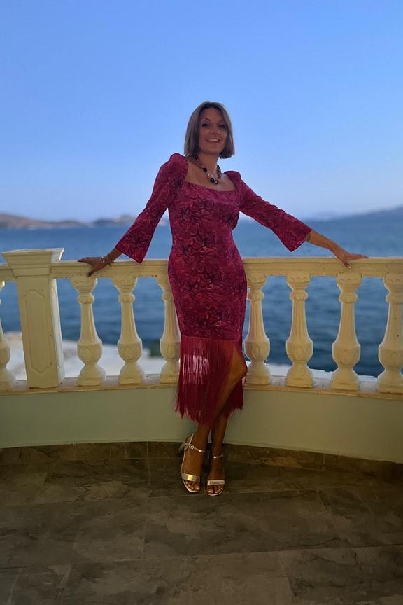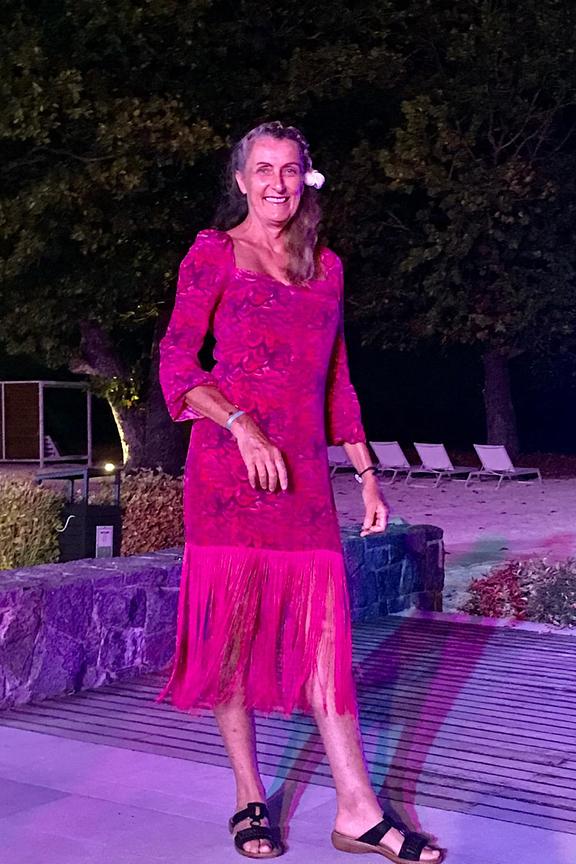 Associez cette robe à des sandales dorées et une pochette discrète pour une allure sophistiquée lors des soirées estivales. • Robe en soie • Coupe droite • Encolure carrée • Manches trois-quarts • Franges élégantes en bas Modèle qui taille petit, privilégiez la taille au dessus.