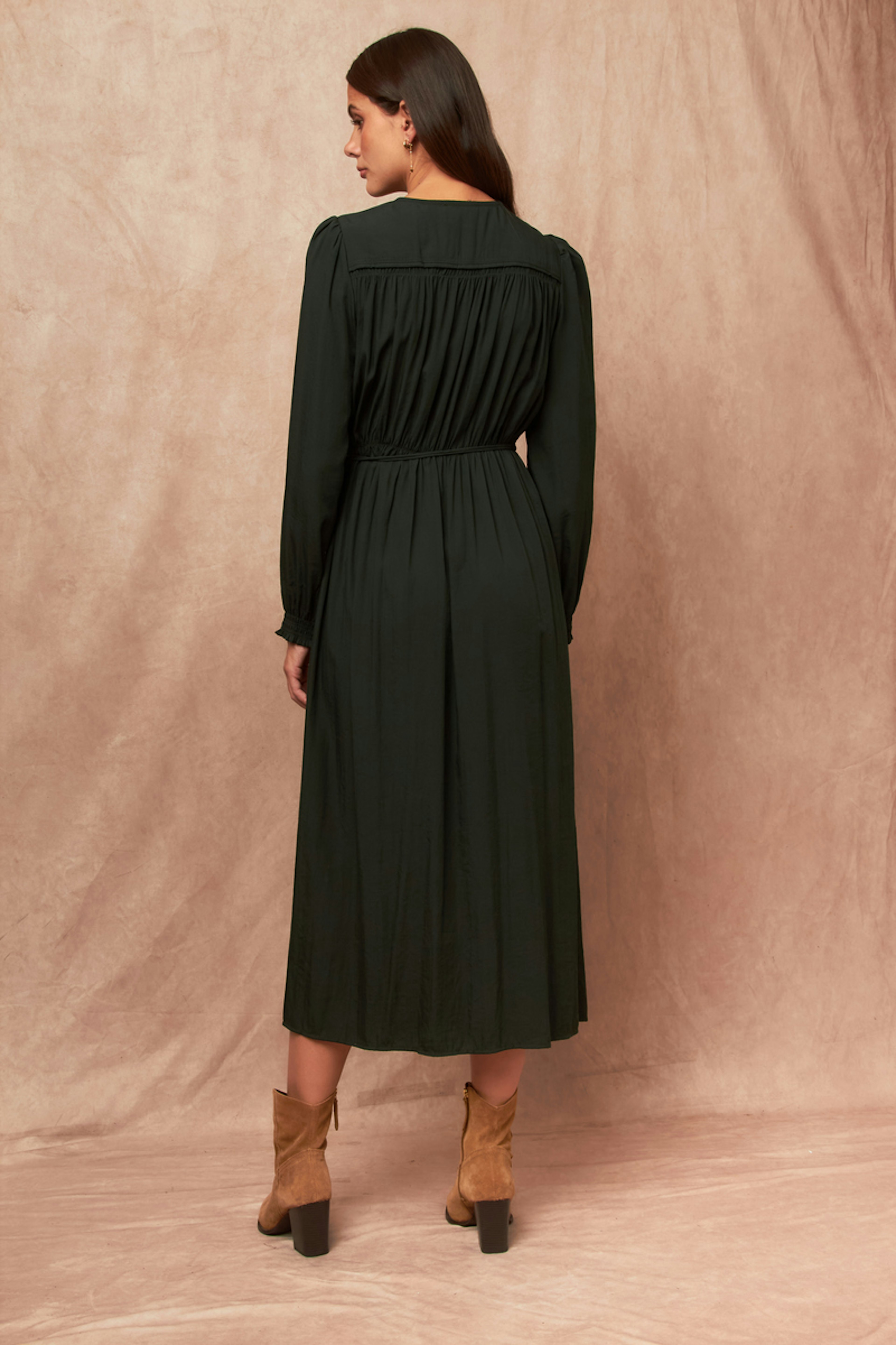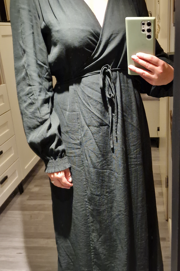 Associez cette robe élégante avec des bottines en cuir pour un style sophistiqué parfait pour toutes les saisons. • Robe portefeuille • Longueur mi-mollet • Décolleté en V • Manches longues • Nœud à la taille