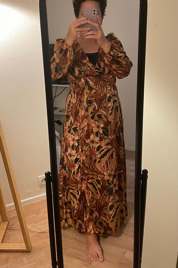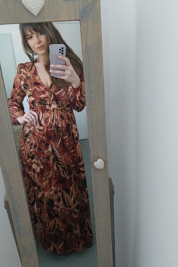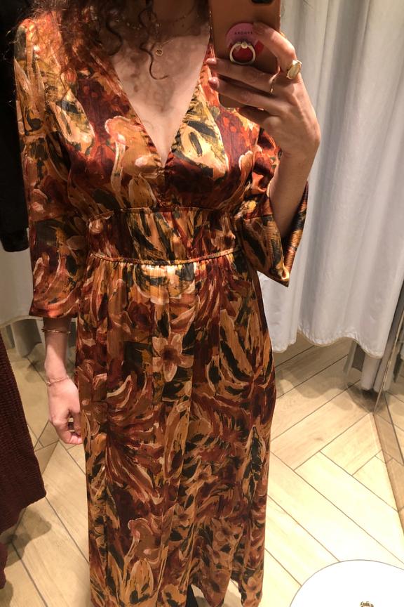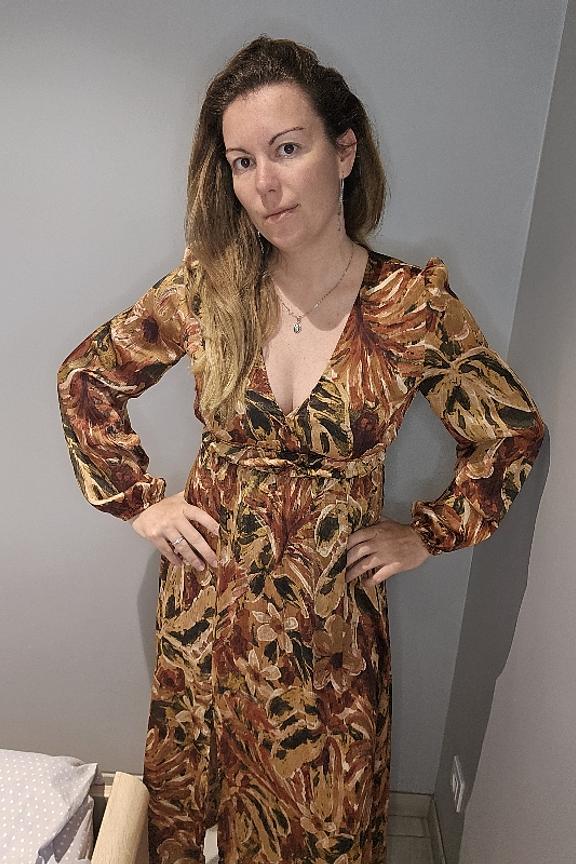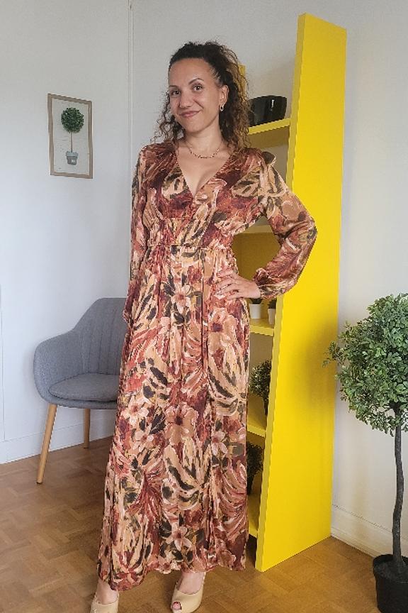 โRobe sublime pour lโautomne notamment avec ses couleurs chaudes. En revanche, la matiรจre est fine donc pas adaptรฉe ร des journรฉes trois fraรฎches et il y a une fente sur le cรดtรฉ qui dรฉvoile largement la jambe. Je lโai portรฉe enceinte, la taille empire รฉlastique รฉtant parfaite pour accompagner le dรฉveloppement du ventre.โ
