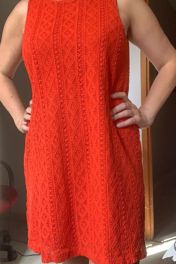 Pour un look estival frais et élégant, associez cette robe rouge avec des sandales dorées et un chapeau de paille. Ajoutez des bijoux délicats pour une touche de sophistication. Idéale pour l'été. • Robe courte en coton et nylon • Coupe droite • Sans manches • Encolure ronde • Motif ajouré