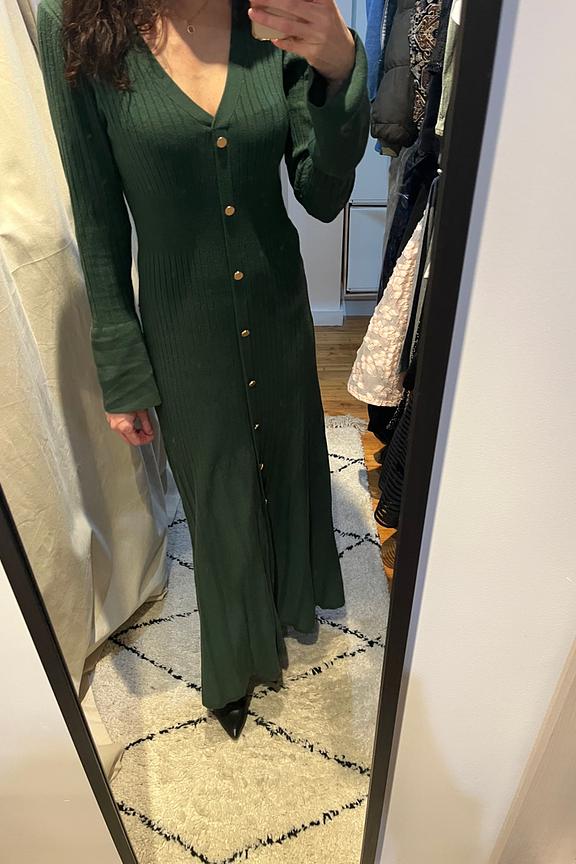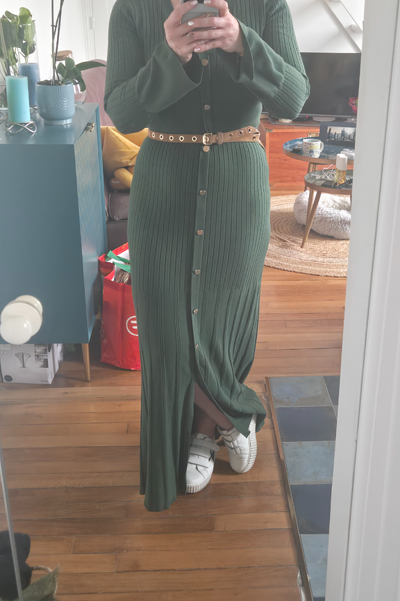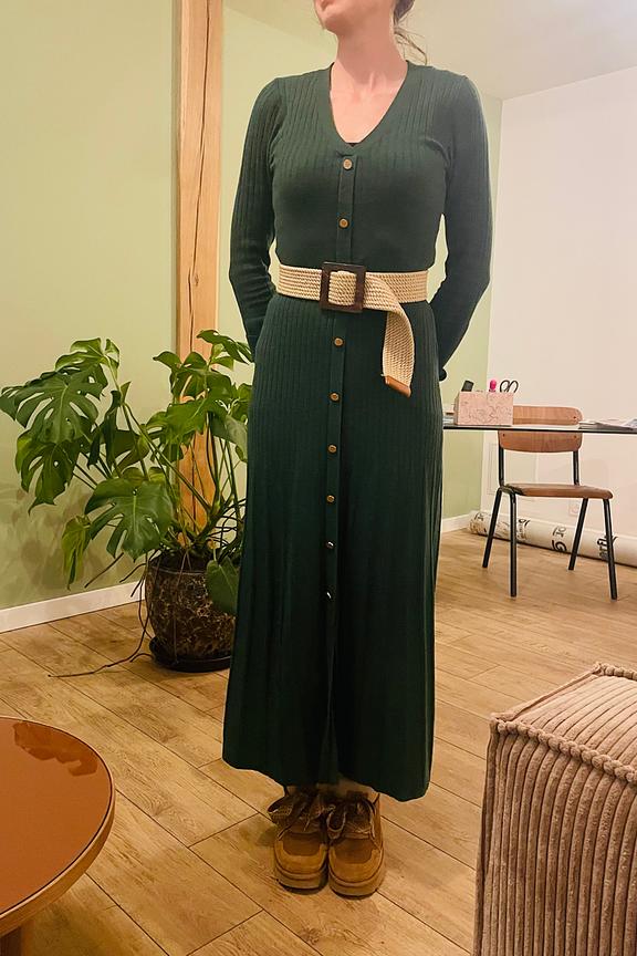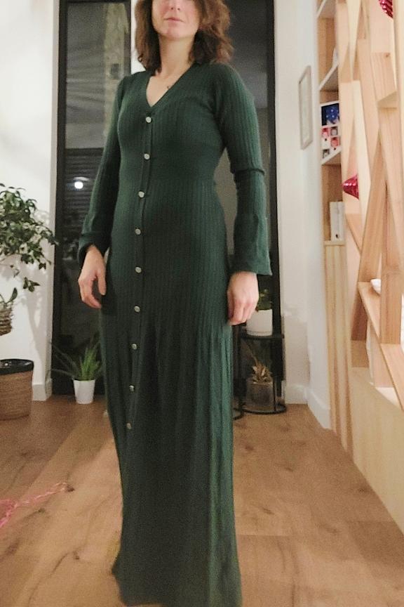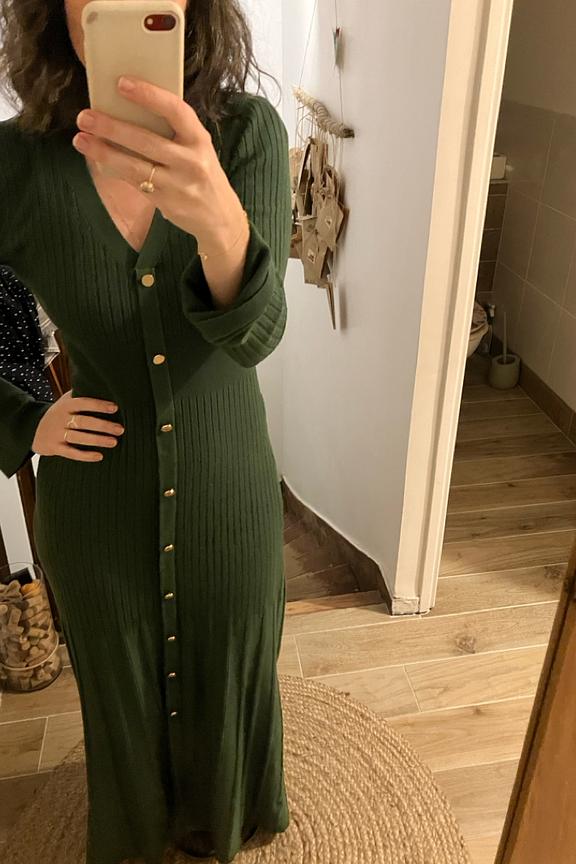 Associez cette robe longue à des bottines en cuir et une écharpe en laine pour une allure chic et cosy durant l'hiver. • Robe longue en maille près du corps • Décolleté en V • Manches longues • Boutonnage sur le devant • Maille côtelée