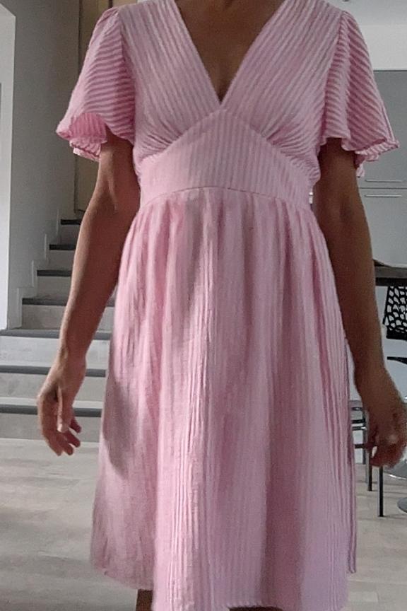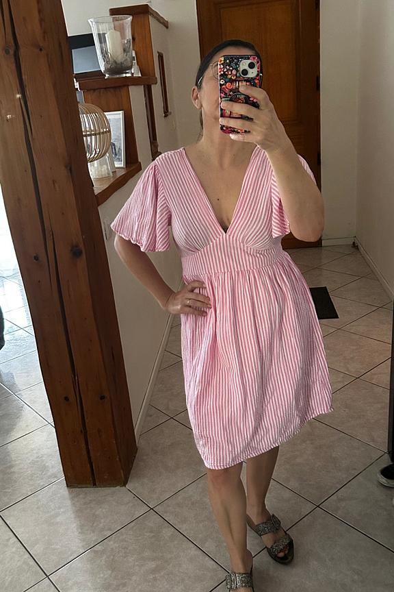 Associez cette robe légère à des sandales en cuir naturel et un chapeau de paille pour une journée ensoleillée. Parfait pour un style estival décontracté et élégant. • Robe courte en coton léger • Décolleté en V flatteur • Manches courtes évasées • Taille cintrée • Motif rayures