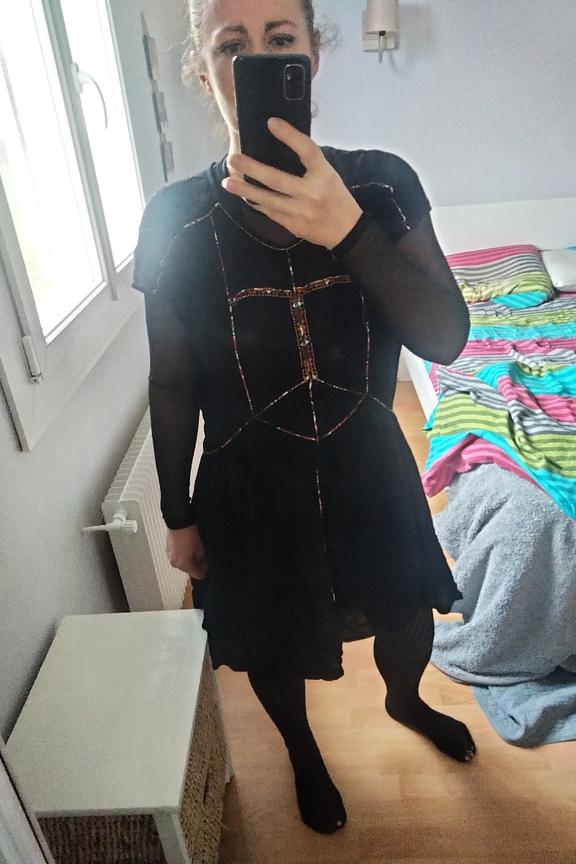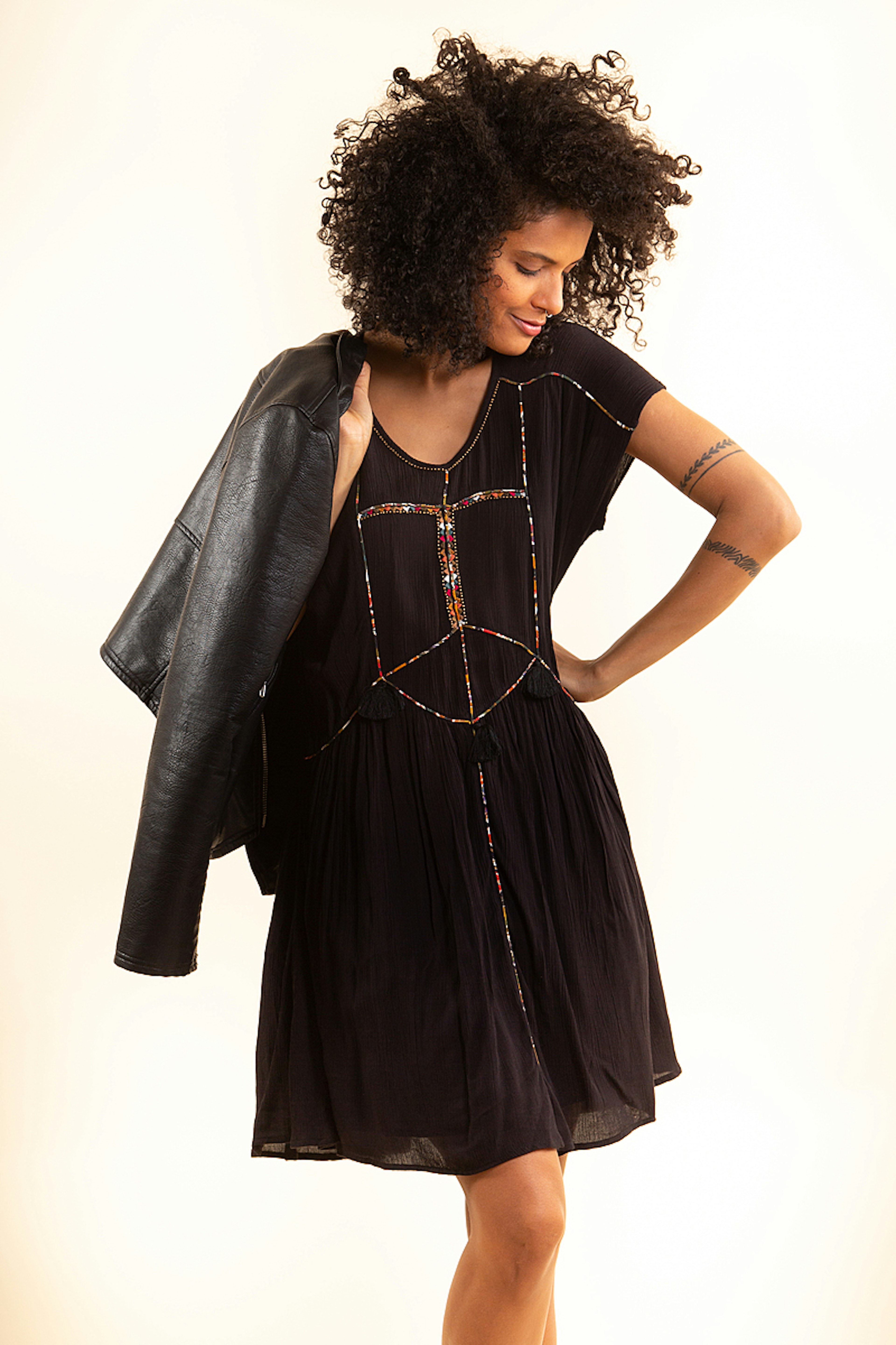 Optez pour cette petite robe noire revisitรฉe avec de jolies broderies et des perles. A porter cet รฉtรฉ avec de jolies sandales en cuir camel.