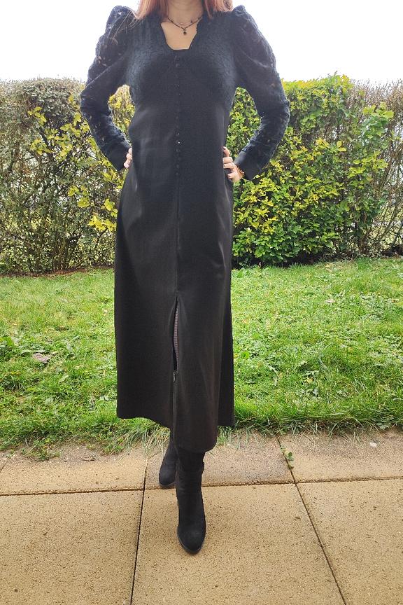 Ajoutez des boucles d'oreilles dorรฉes et des bottines pour un look chic, parfait en toute saison. โข Robe longue โข Manches en dentelle โข Dรฉcolletรฉ en V โข Fente sur la cuisse โข Boutonnage sur le devant