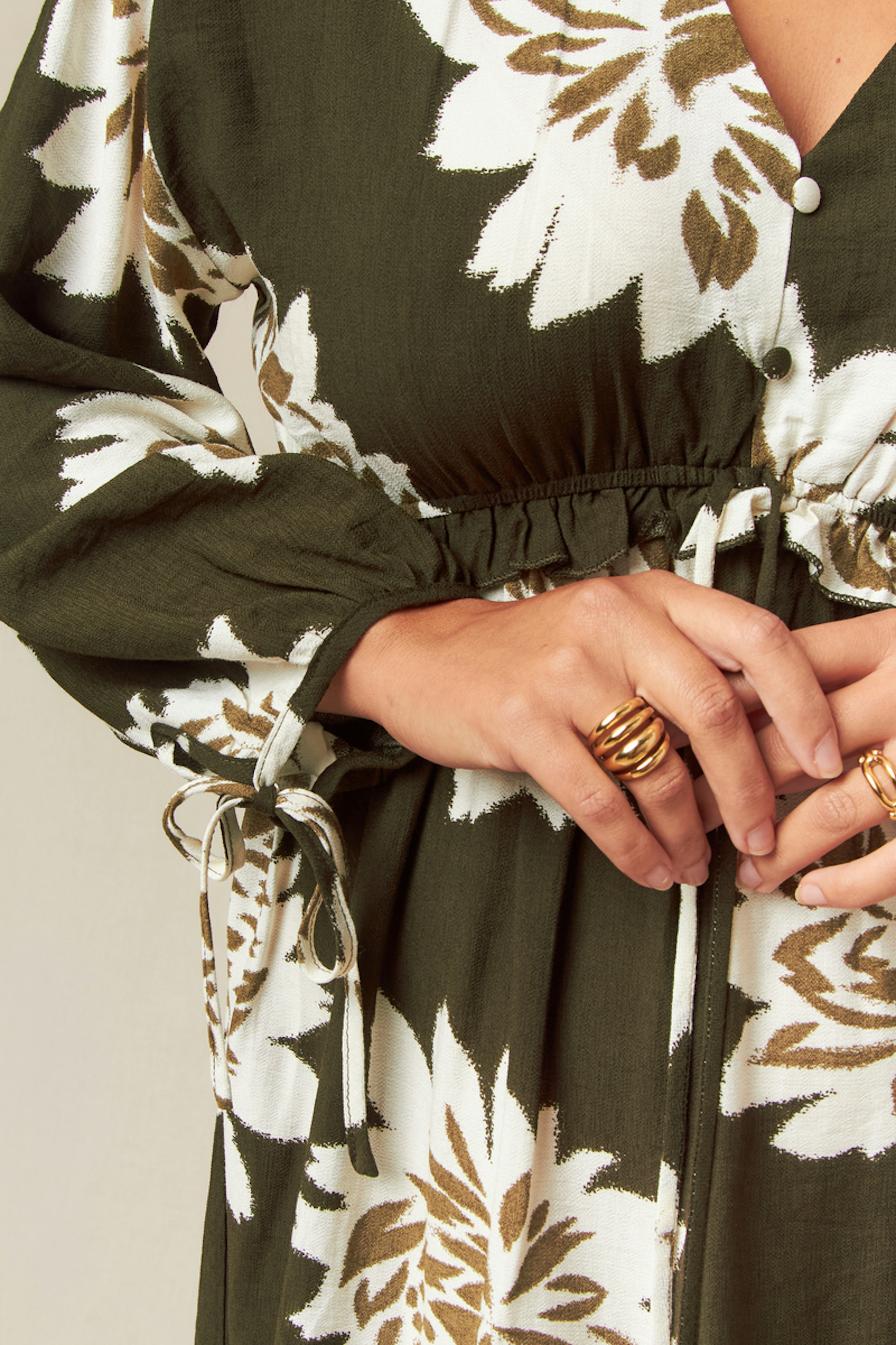 Associez cette robe à imprimé avec des bottines en cuir et un chapeau en feutre pour une allure bohème chic en hiver. • Robe longue • Décolleté en V • Manches longues • Taille élastiquée • Imprimé floral
