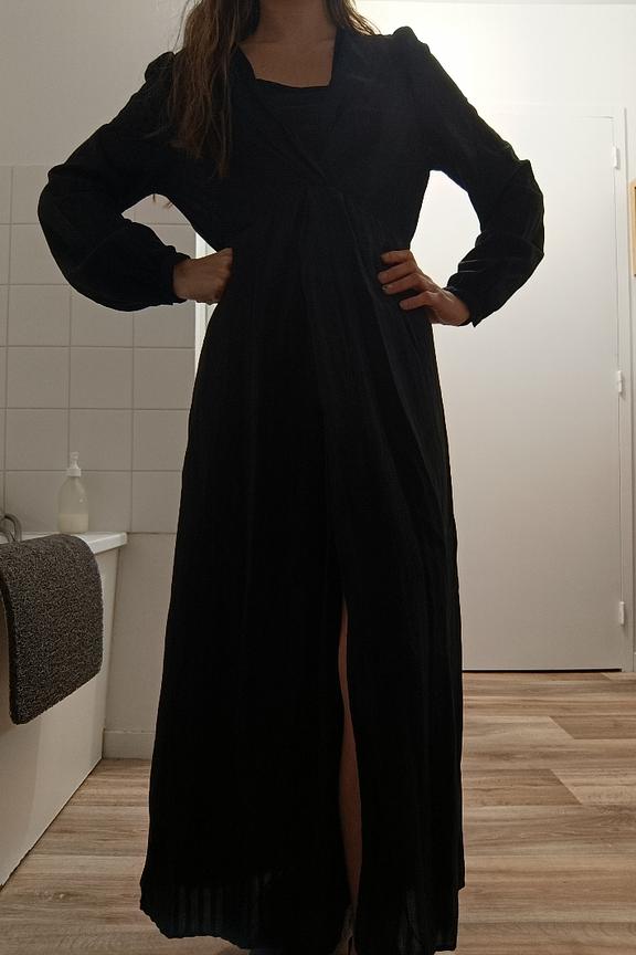Associez cette robe รฉlรฉgante avec des escarpins nude et une pochette mรฉtallique pour une touche chic. Parfait pour toutes les occasions ! โข Robe longue fluide โข Dรฉcolletรฉ en V โข Manches longues โข Taille cintrรฉe โข Fente รฉlรฉgante sur le cรดtรฉ