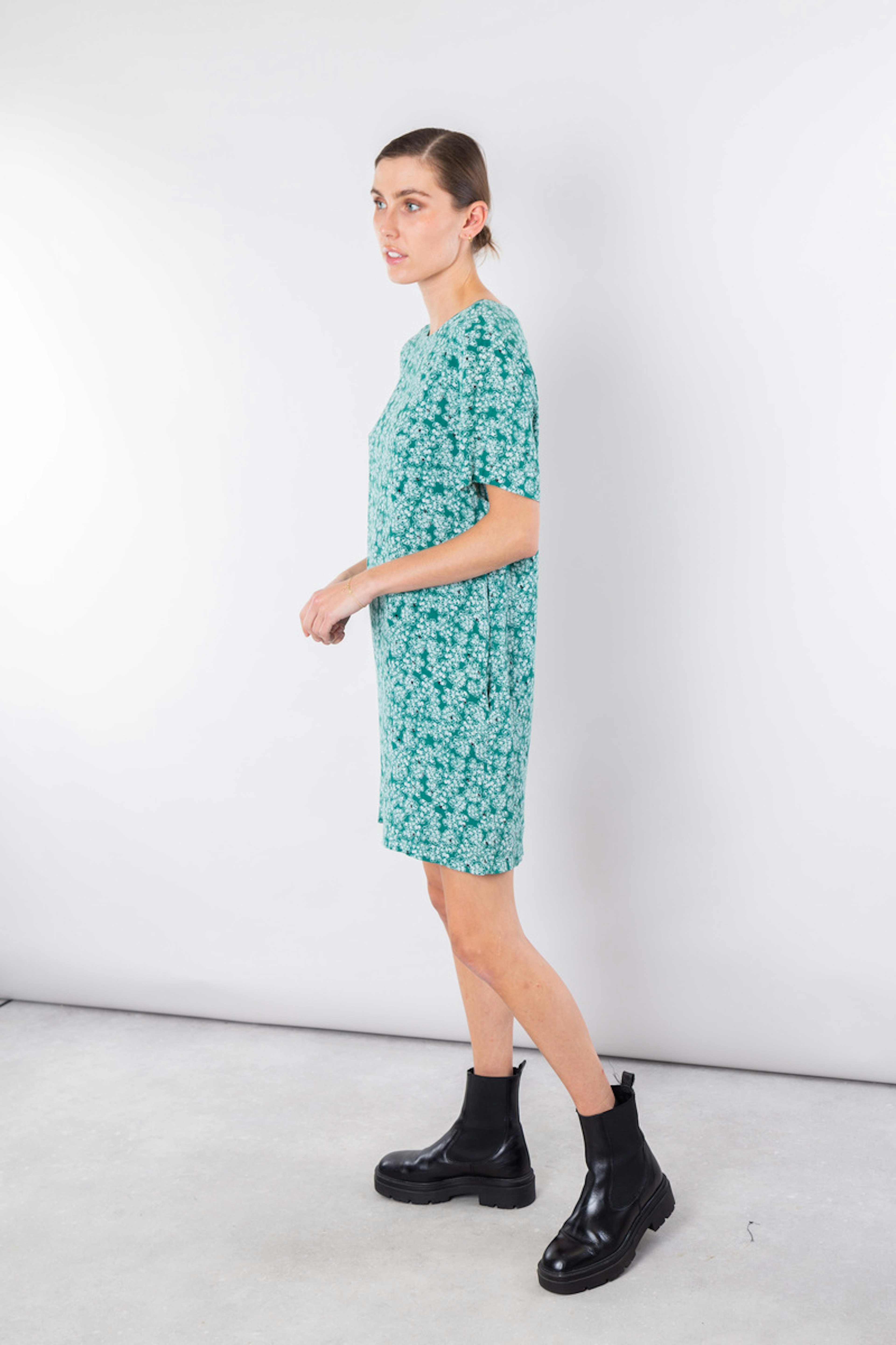 โข Robe courte vert avec motifs fleuris blancs โข Col rond โข Manches courtes โข Poches ouvertes โข Coupe droite et ample โข Lรฉgรจre ouverte dans le dos