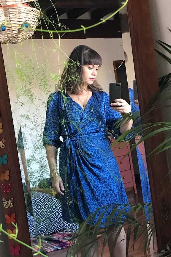 โข Robe longueur midi et manches 3/4 โข Tissu fluide et satinรฉ, imprimรฉ de tรขches faรงon camouflage โข Dรฉcolletรฉ V croisรฉ en cache-coeur โข Taille marquรฉe avec bouton et rubans ร nouer โข Jupe en portefeuille