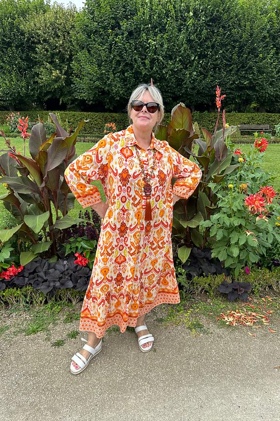 โข Robe blanche ร motif orange โข Manches longues โข Longueur midi โข Col chemise โข Boutons ร l'avant