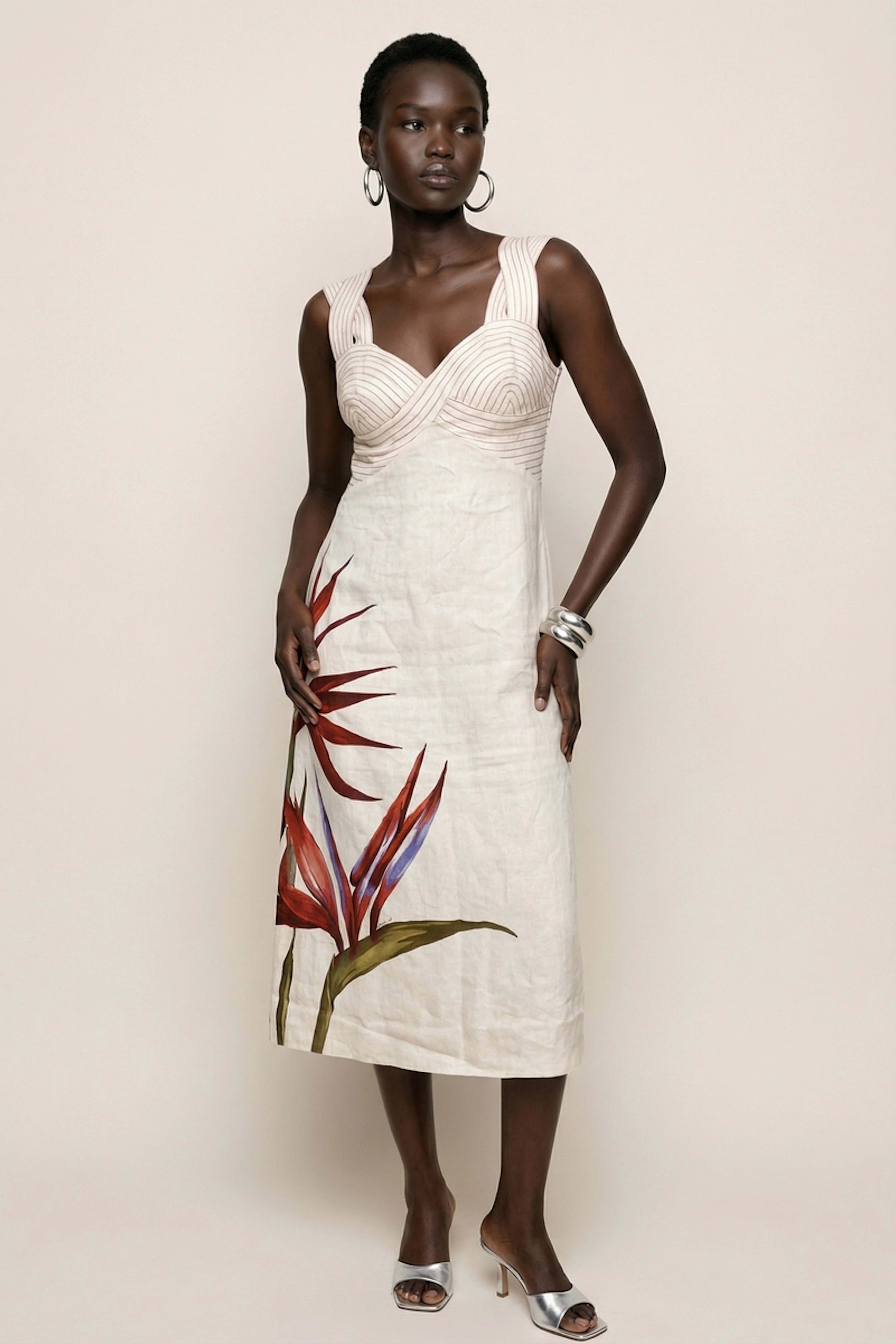 Portez-la avec des sandales dorées et un chapeau large pour une allure estivale chic. • Robe mi-longue • Taille empire flatteuse • Bretelles larges • Imprimé végétal • Tissus légers et fluides