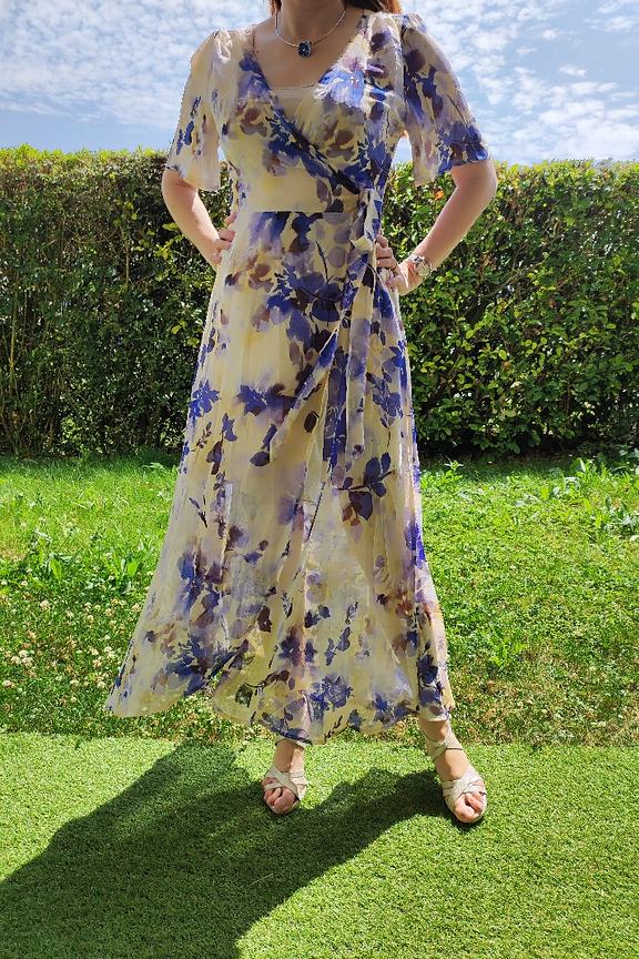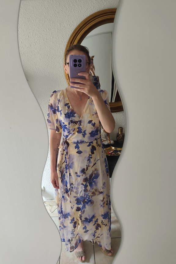 Associez cette robe portefeuille à des sandales nude et une pochette en osier pour une allure estivale. • Robe portefeuille • Décolleté en V • Manches courtes • Longueur midi • Motif imprimé floral