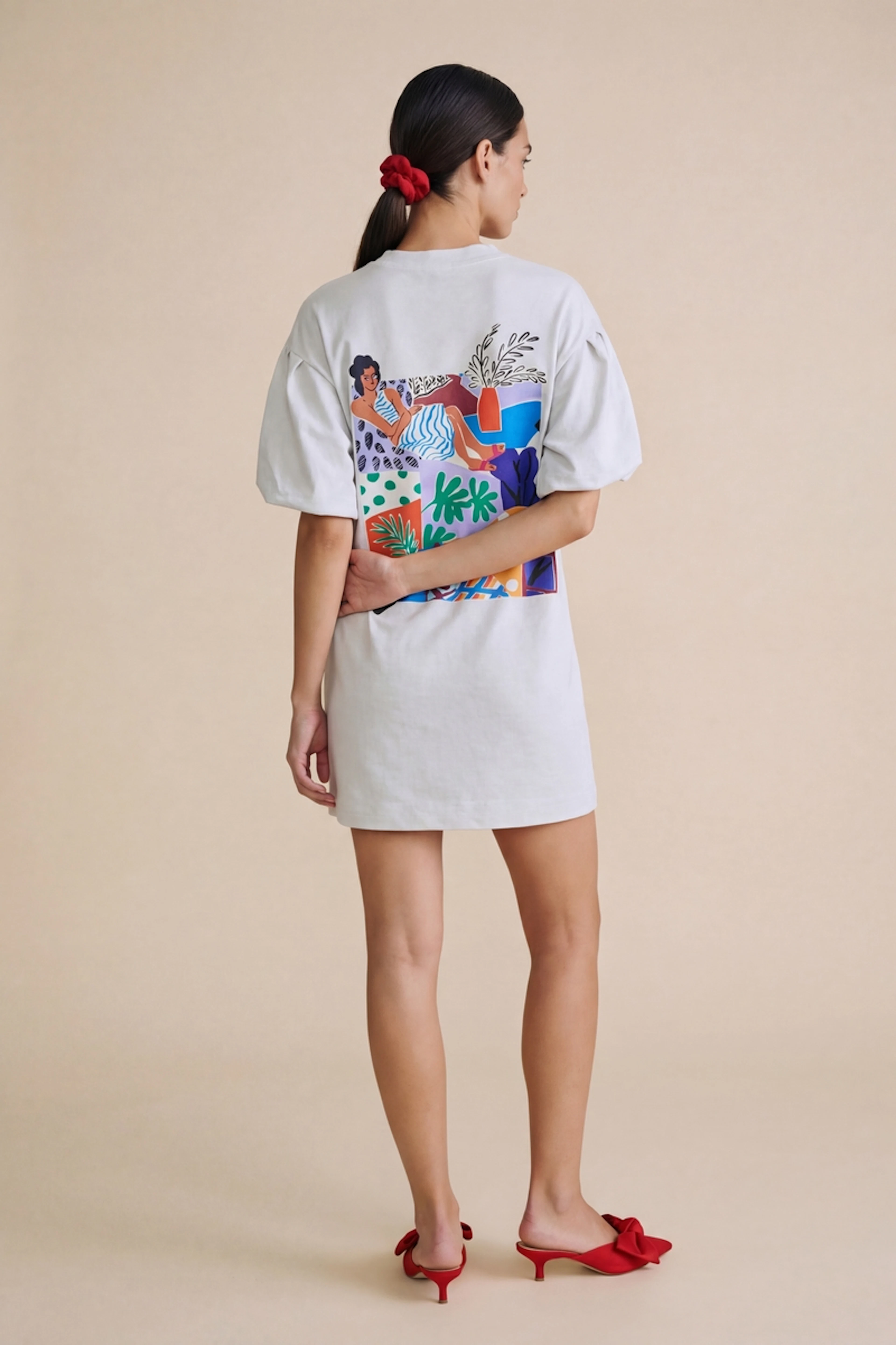 Associe cette robe à une paire de sandales colorées et un sac en osier pour un look estival et léger. Parfait pour les journées ensoleillées ! • Robe courte en coton • Coupe ample • Manches courtes • Col rond classique • Motif vibrant au dos