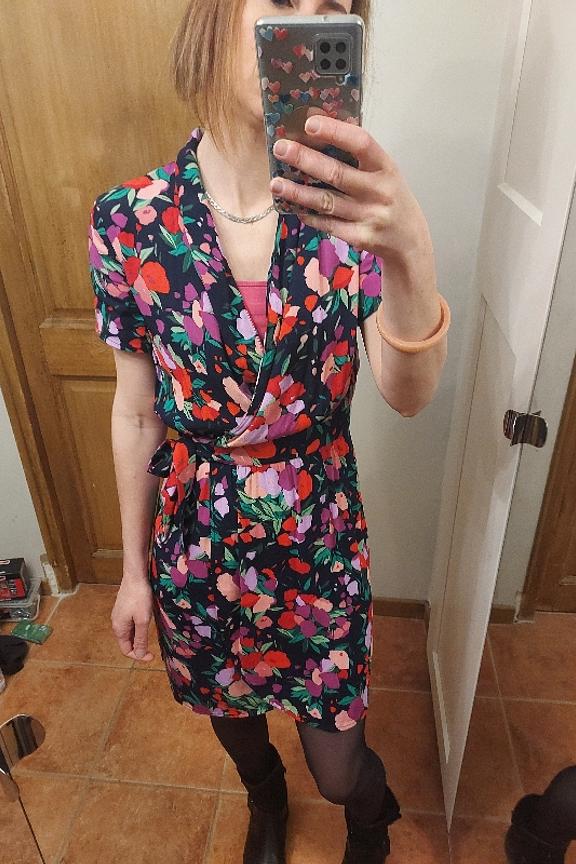 โข Robe courte imprimรฉ floral sur fond noir โข Manches courtes โข Longueur genou โข Taille cintrรฉe par une ceinture en tissu โข Coupe portefeuille