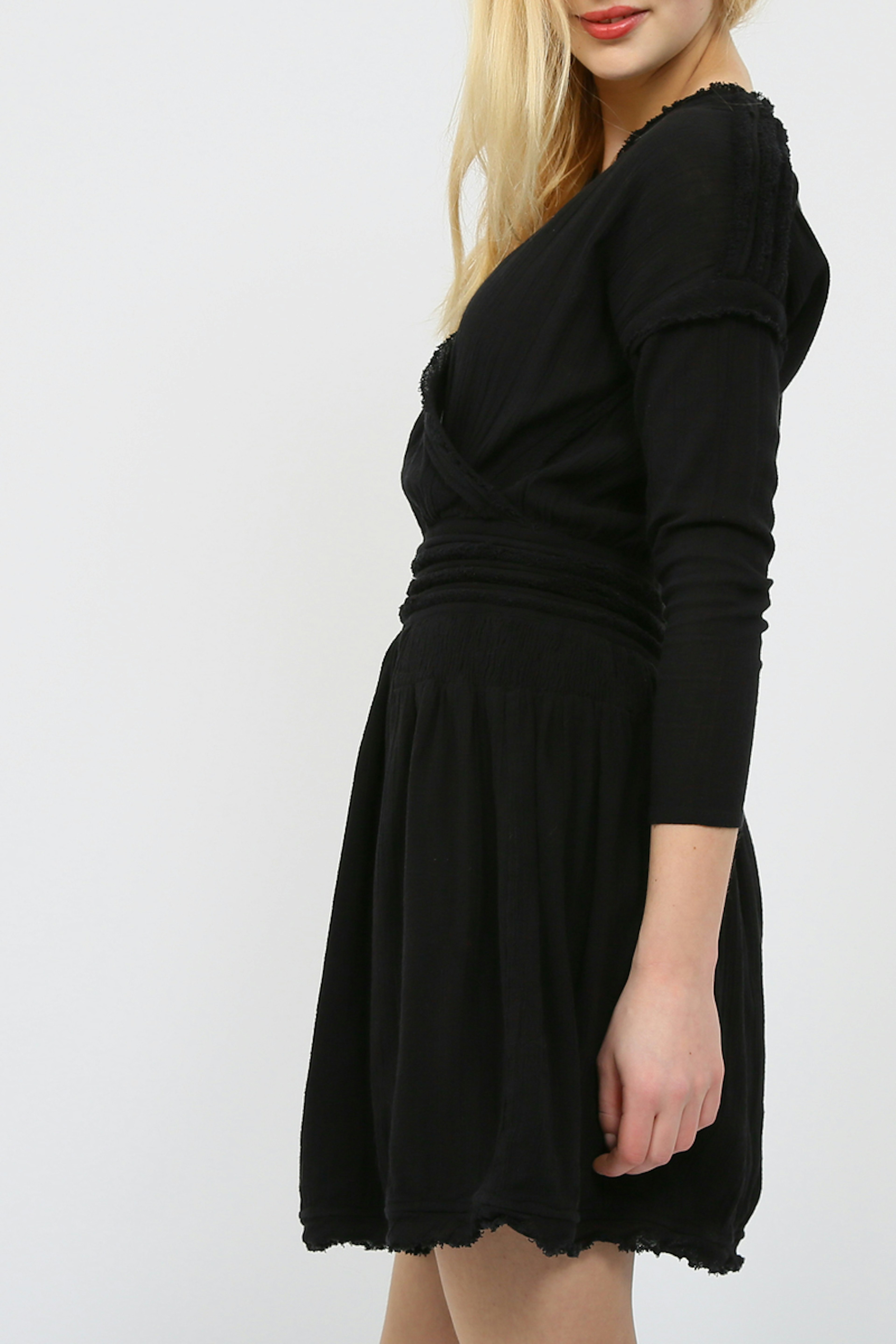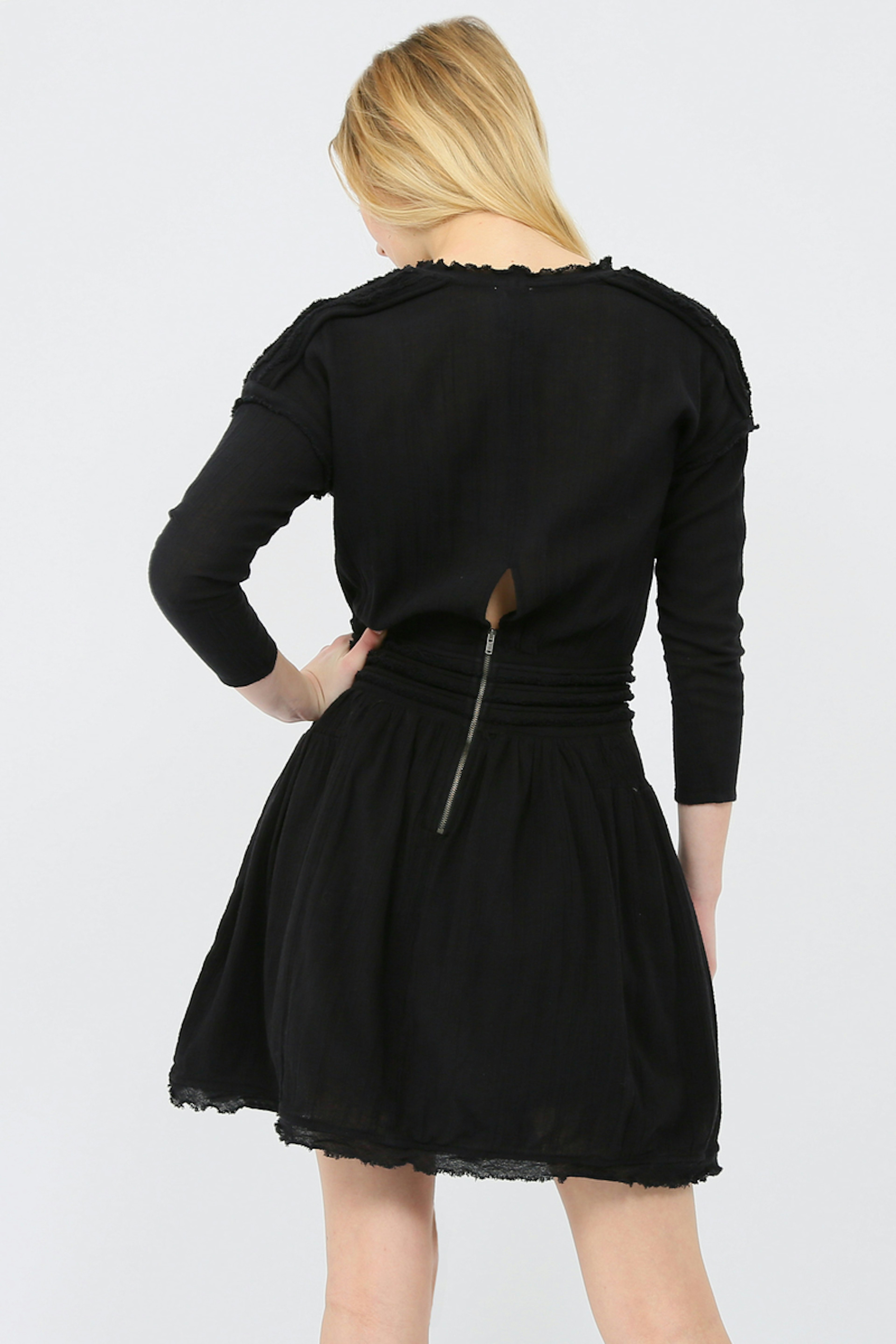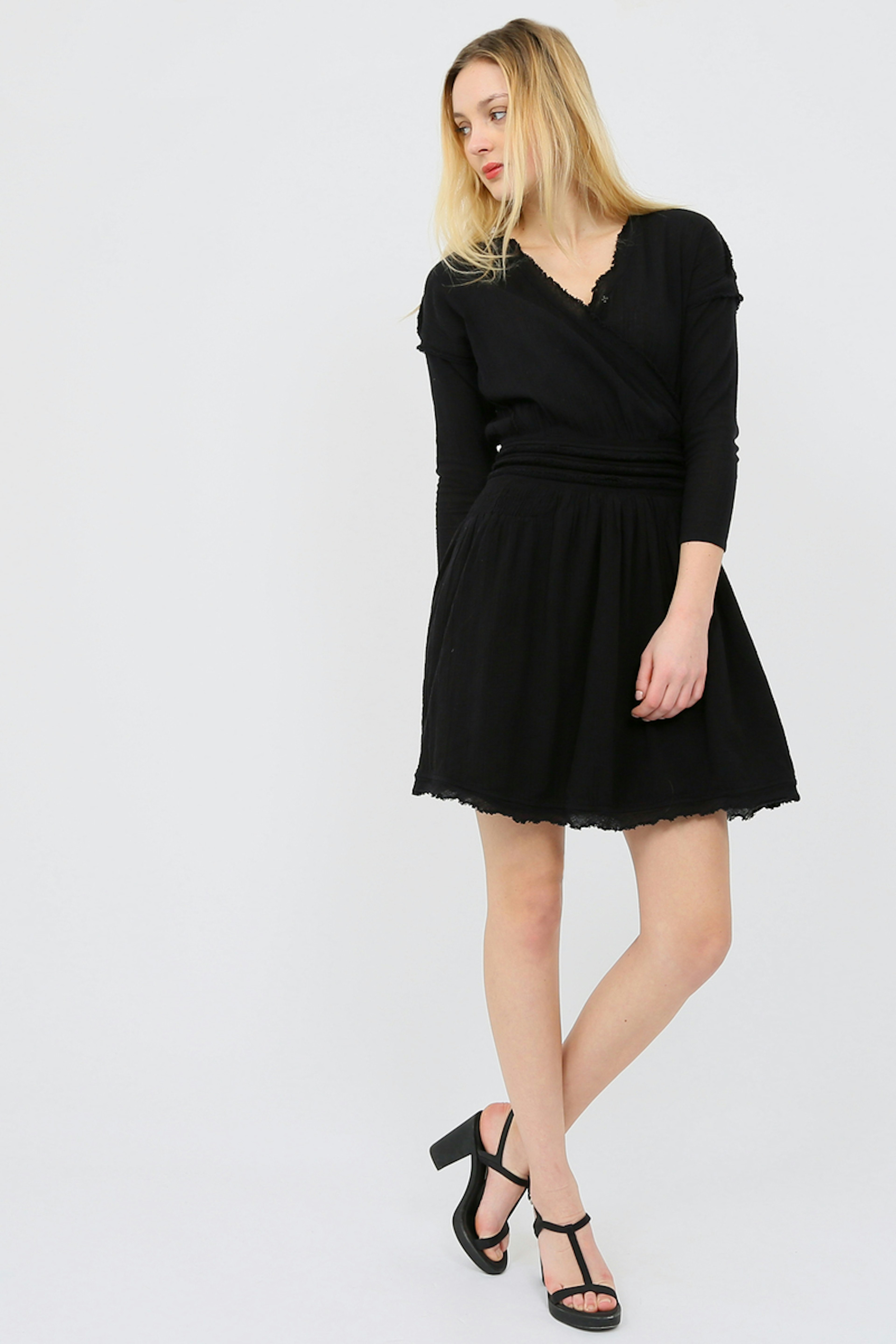 Robe noire, mi-longue, manches 3/4. Cintrรฉe ร la taille avec zip dans le dos, haut cache coeur avec une pression au niveau de la poitrine. <br> La mannequin mesure 1,74 mรจtre, son tour de taille est de 62 centimรจtres, son tour de hanche est de 89 centimรจtres et son tour de poitrine est de 86 centimรจtres (85C).