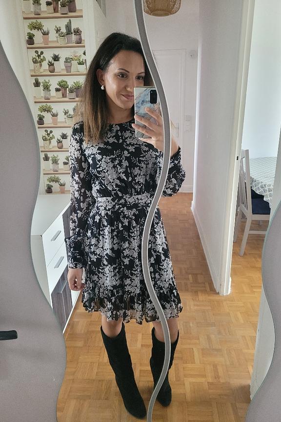 Ajoutez une ceinture élégante et des bottes hautes pour un look hivernal chic. • Robe courte • Manches longues • Coupe fluide • Col rond • Motif floral