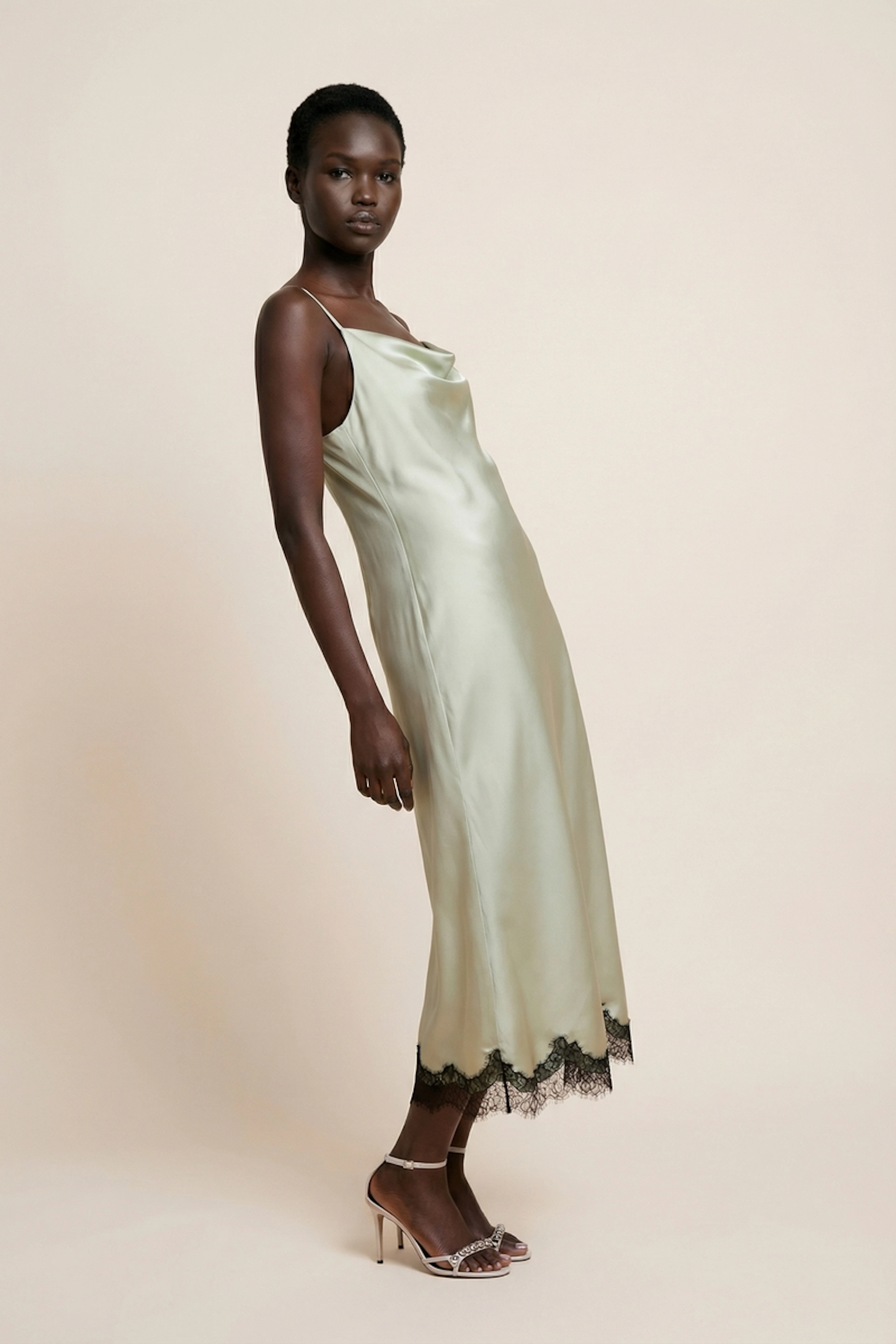 Portez-la avec des sandales dorées et un châle léger pour une touche estivale raffinée. • Robe longue • Décolleté drapé • Bretelles fines • Coupe fluide • Ourlet en dentelle élégante