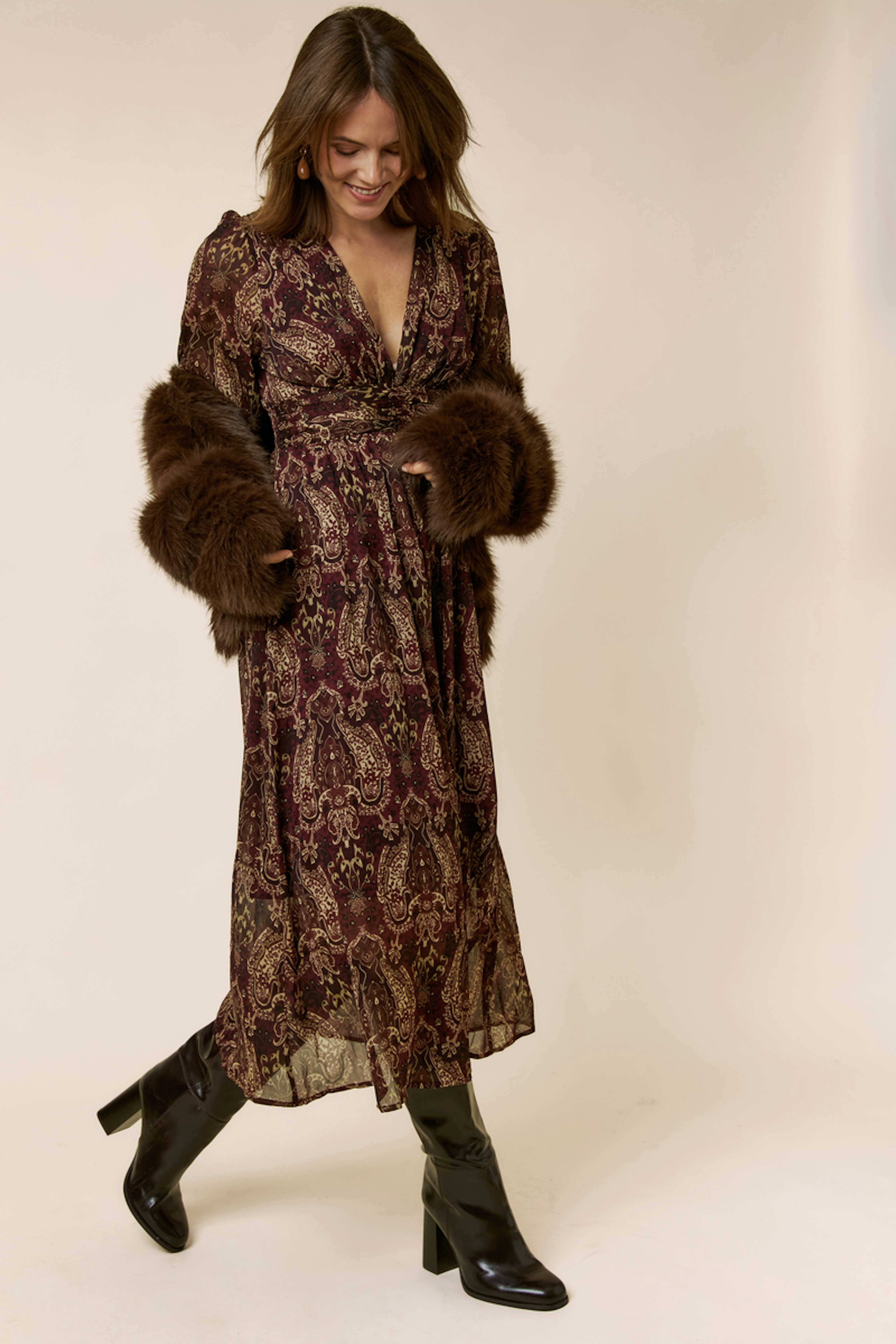 Pour un look chic d'hiver, associez cette robe imprimée à des bottes hautes en cuir noir et un manteau long pour un style raffiné. • Robe midi • Décolleté en V • Manches longues • Tissu léger imprimé • Parfaite pour l'hiver