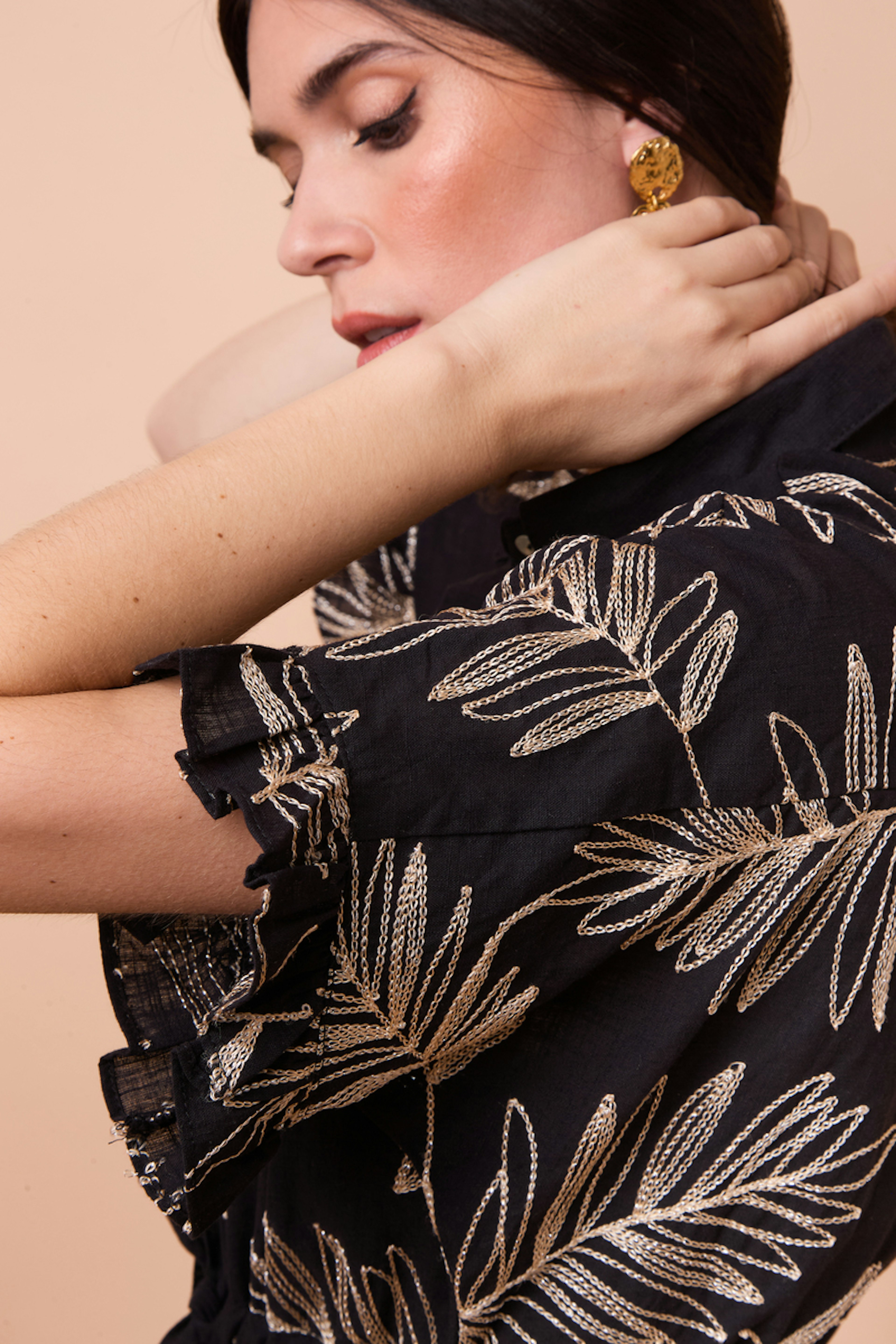 Ajoutez des sandales dorées et un sac en osier pour un look estival chic. • Robe courte en coton • Manches courtes • Col chemise • Taille ceinturée • Motif imprimé