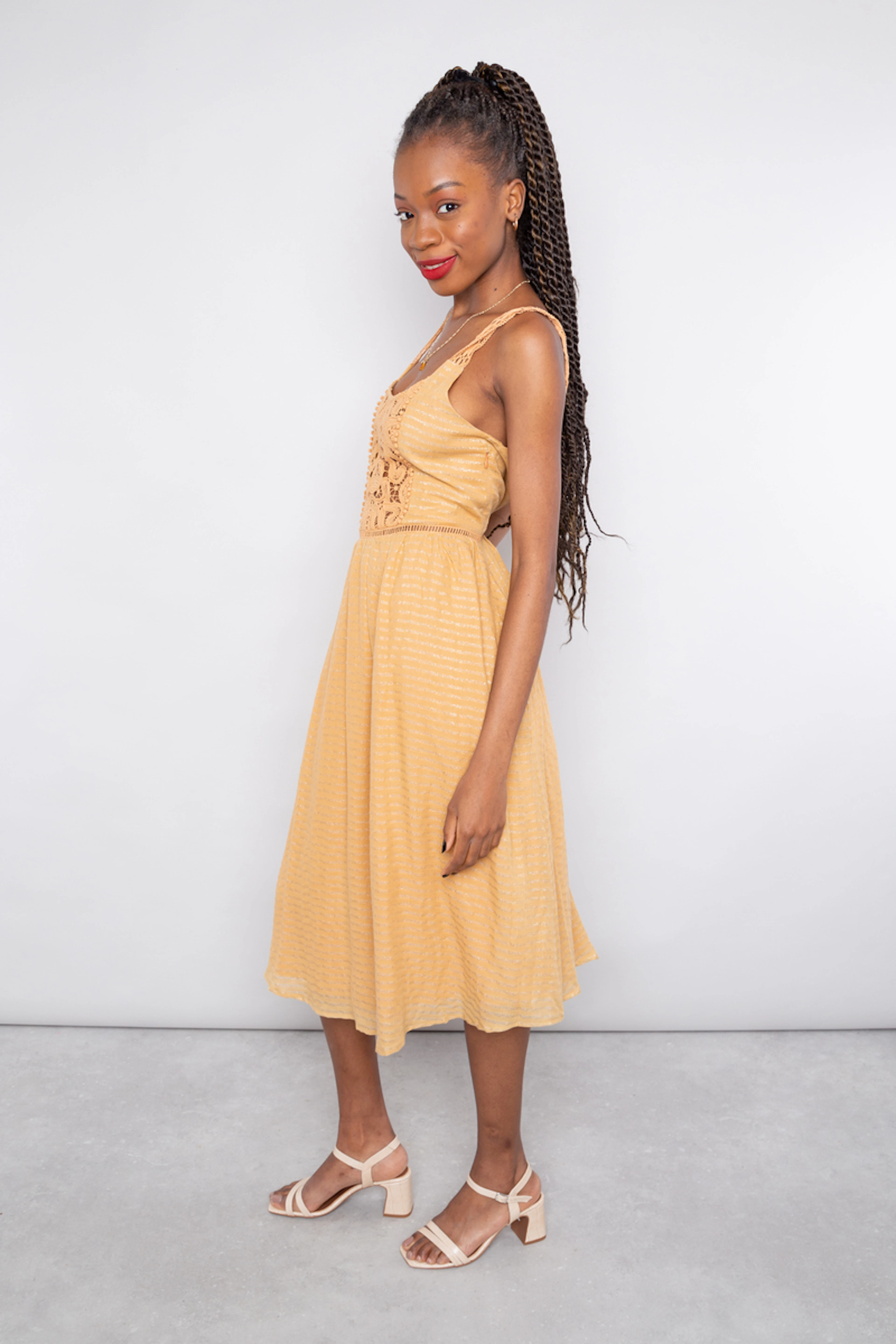 • Robe longue d'été • Macramé en dentelle non doublé • Découpe en dentelle ajourée au niveau de la taille • Bretelles en dentelle de coton • Rayures dorées en fils lurex • Couleur tomette • Tissu tissé en France • Coupe “loose-fit” (si vous souhaitez un aspect plus cintré, prenez une taille en dessous de votre taille habituelle) • Cette matière est délicate, nous vous conseillons un lavage à la main et un séchage naturel.