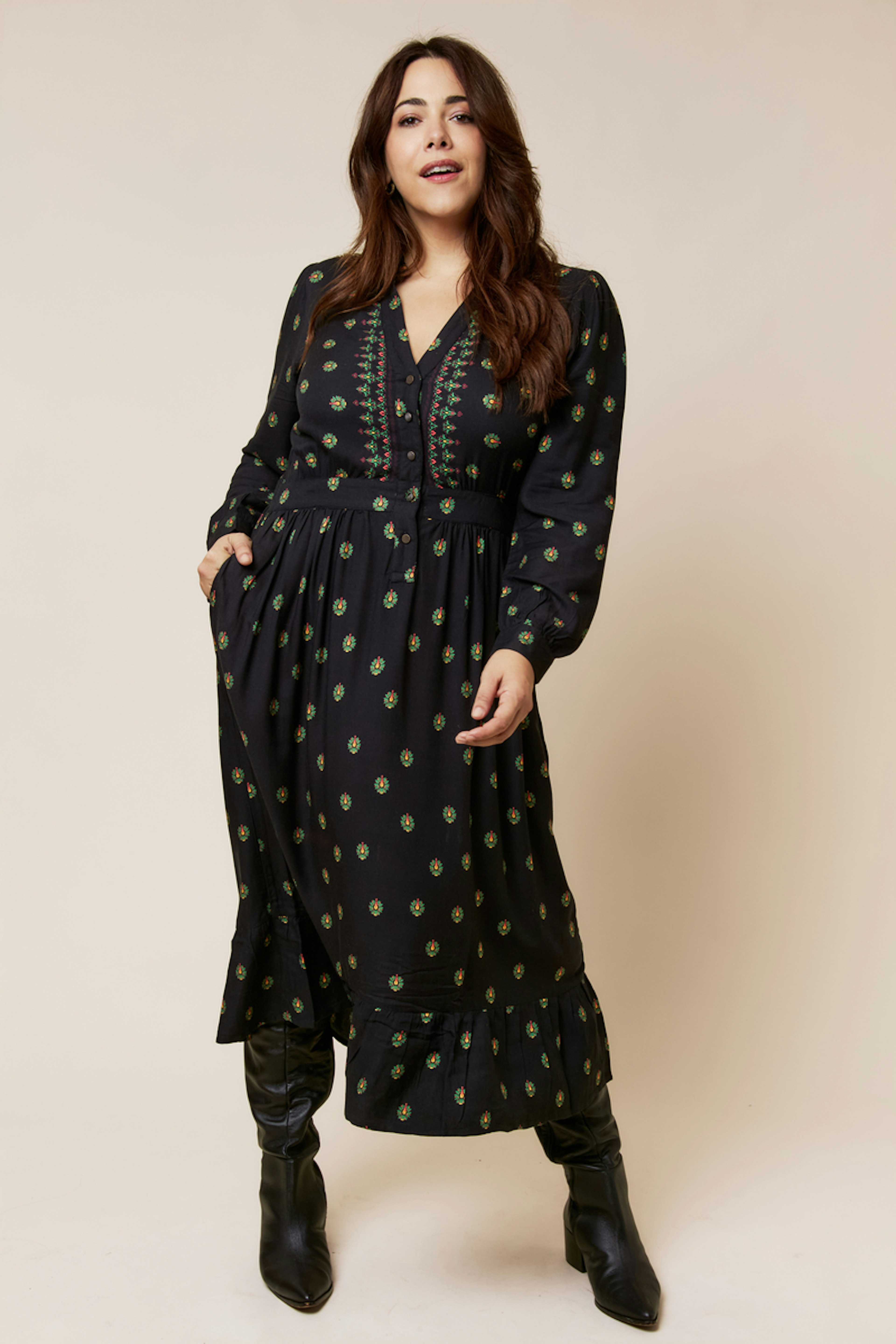 Optez pour cette robe avec des bottines en cuir et un chapeau feutre pour un look hivernal élégant et tendance. • Robe longue imprimée • Taille cintrée flatteuse • Manches longues élégantes • Col en V subtil • Détails boutonnière avant