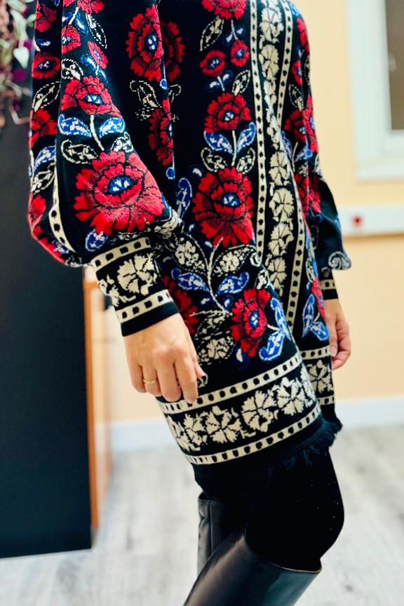 Associez cette robe aux bottes hautes et à un manteau en laine pour une allure chic hivernale. Ajoutez un sac à main assorti pour une touche finale élégante. • Robe courte • Coupe droite • Manches longues • Col rond • Motif floral