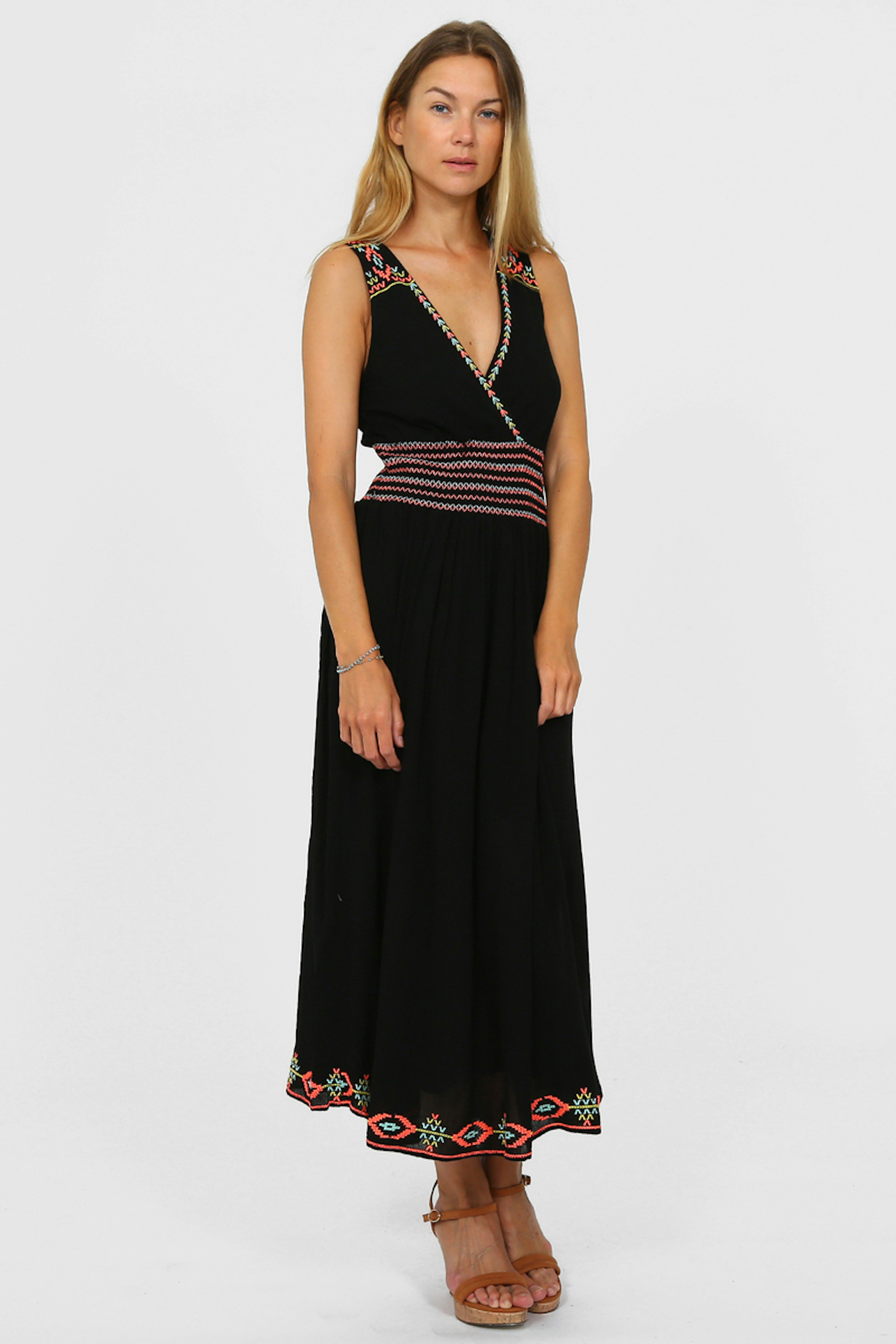 Robe longue noire sans manches avec broderies colorรฉes. Col en V devant et dans le dos.