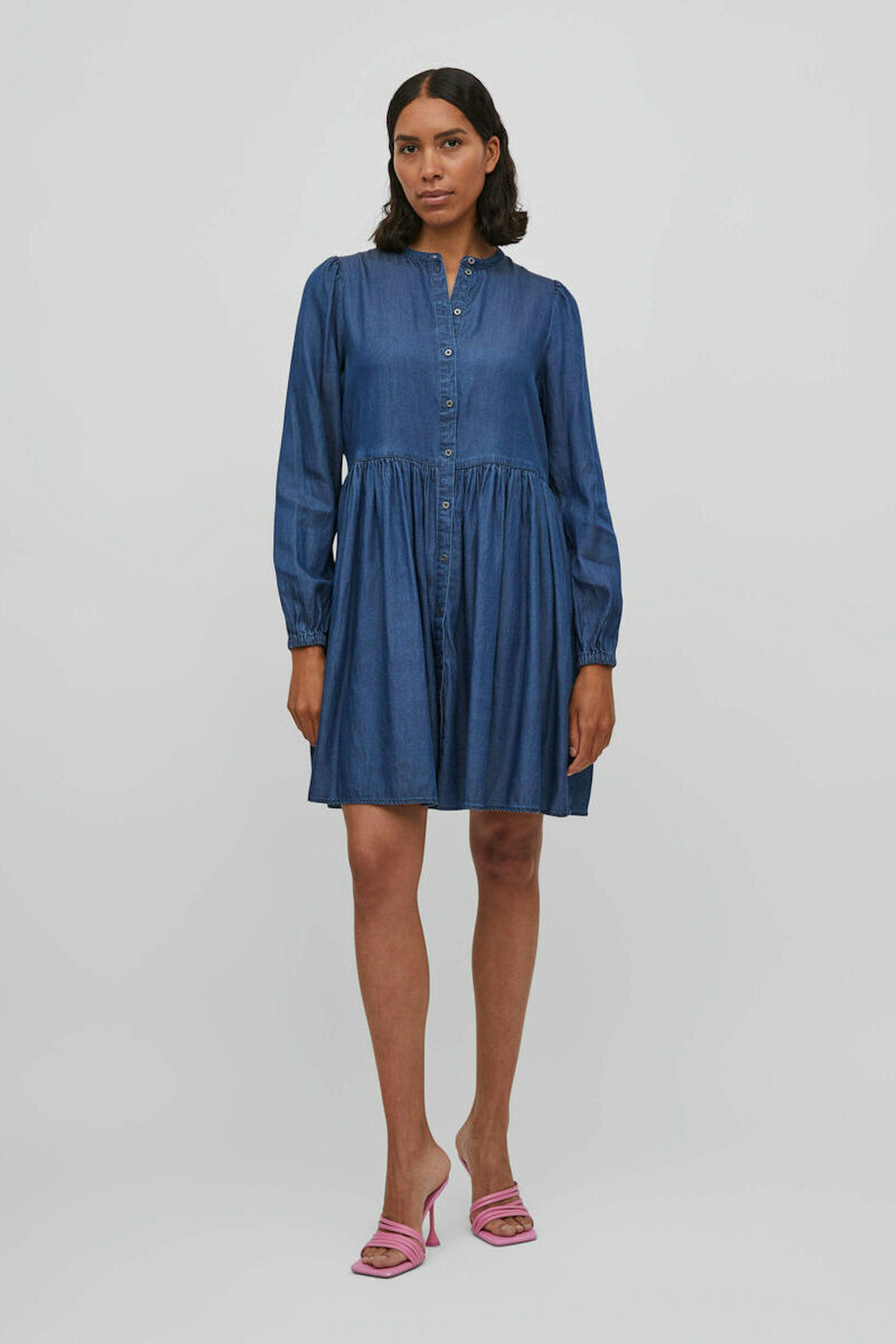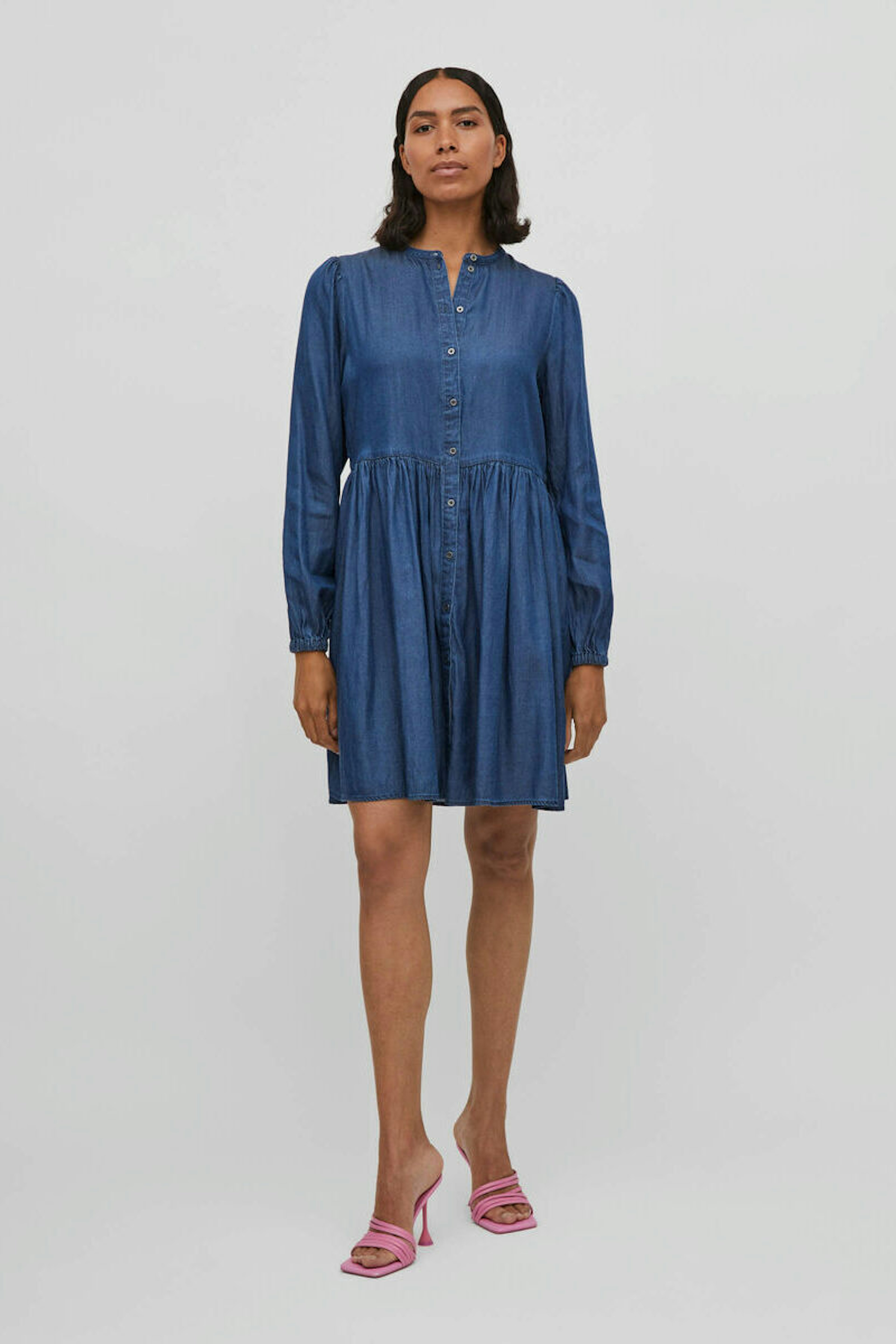 โข Robe en jean bleu โข Coupe droite โข Volants sur le bas de la jupe โข Conรงue en tencel โข Boutons sur le devant