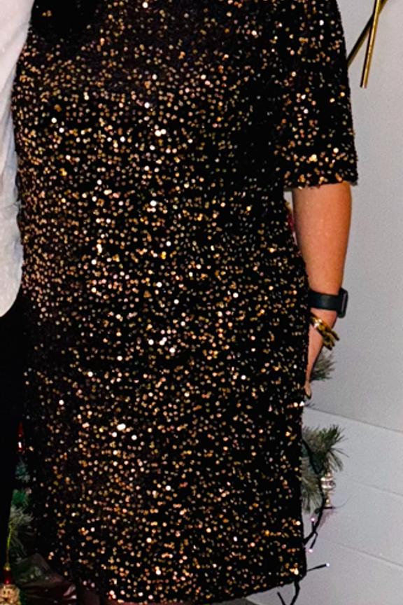 Ajoutez des escarpins noirs et une pochette dorรฉe pour une allure chic et festive cet hiver. โข Robe courte ร sequins dorรฉ โข Coupe droite โข Manches courtes โข Col rond