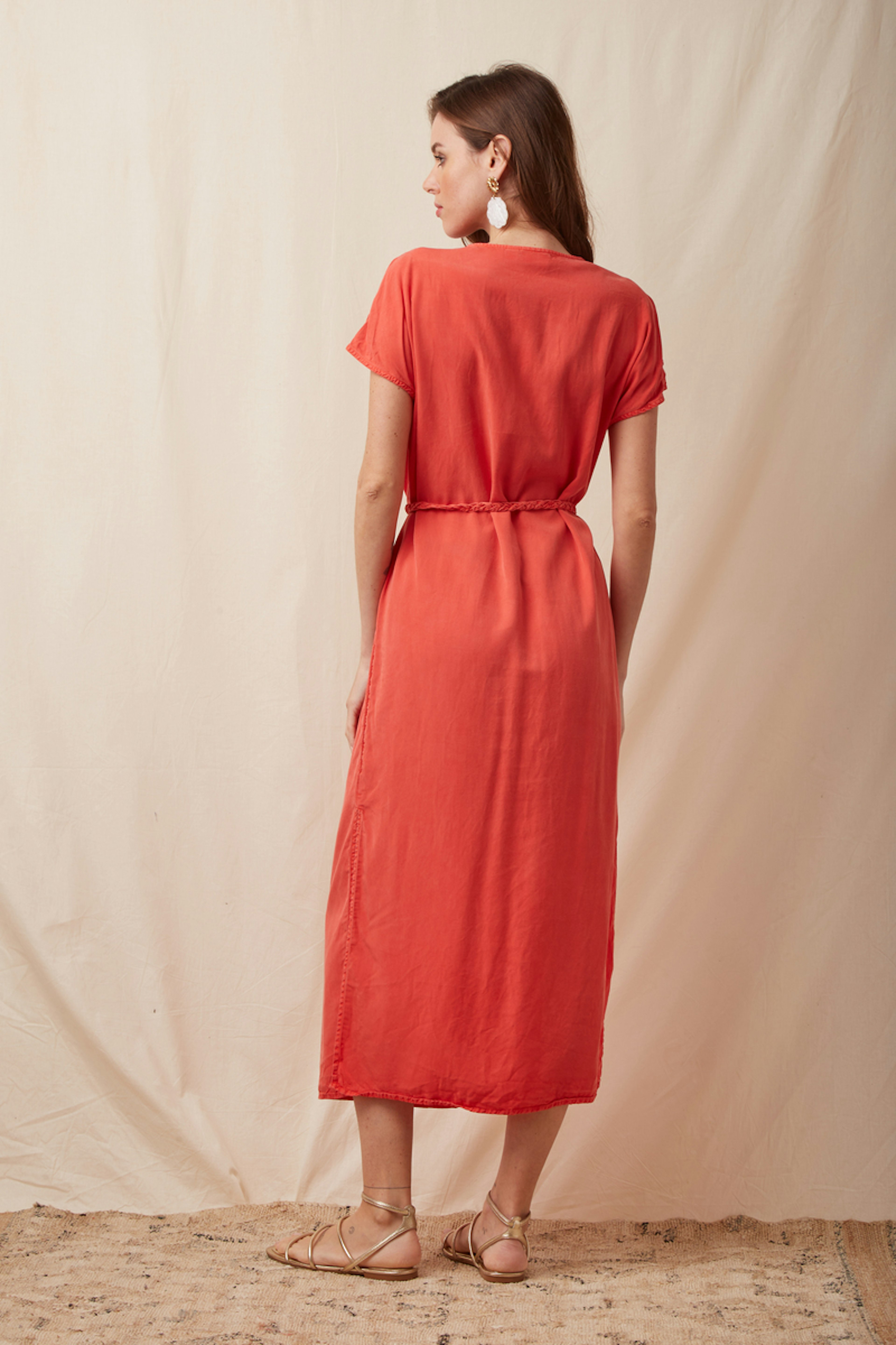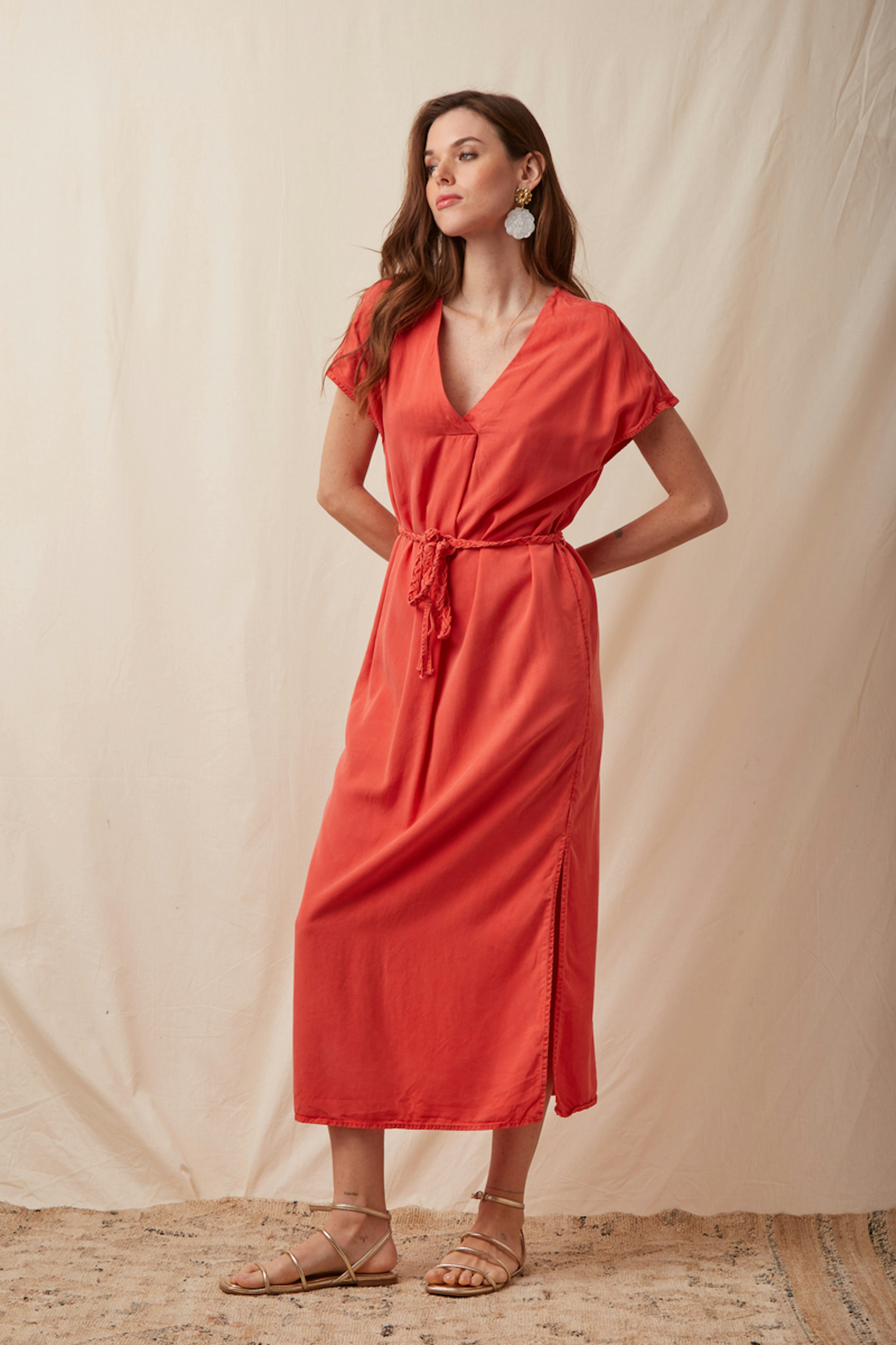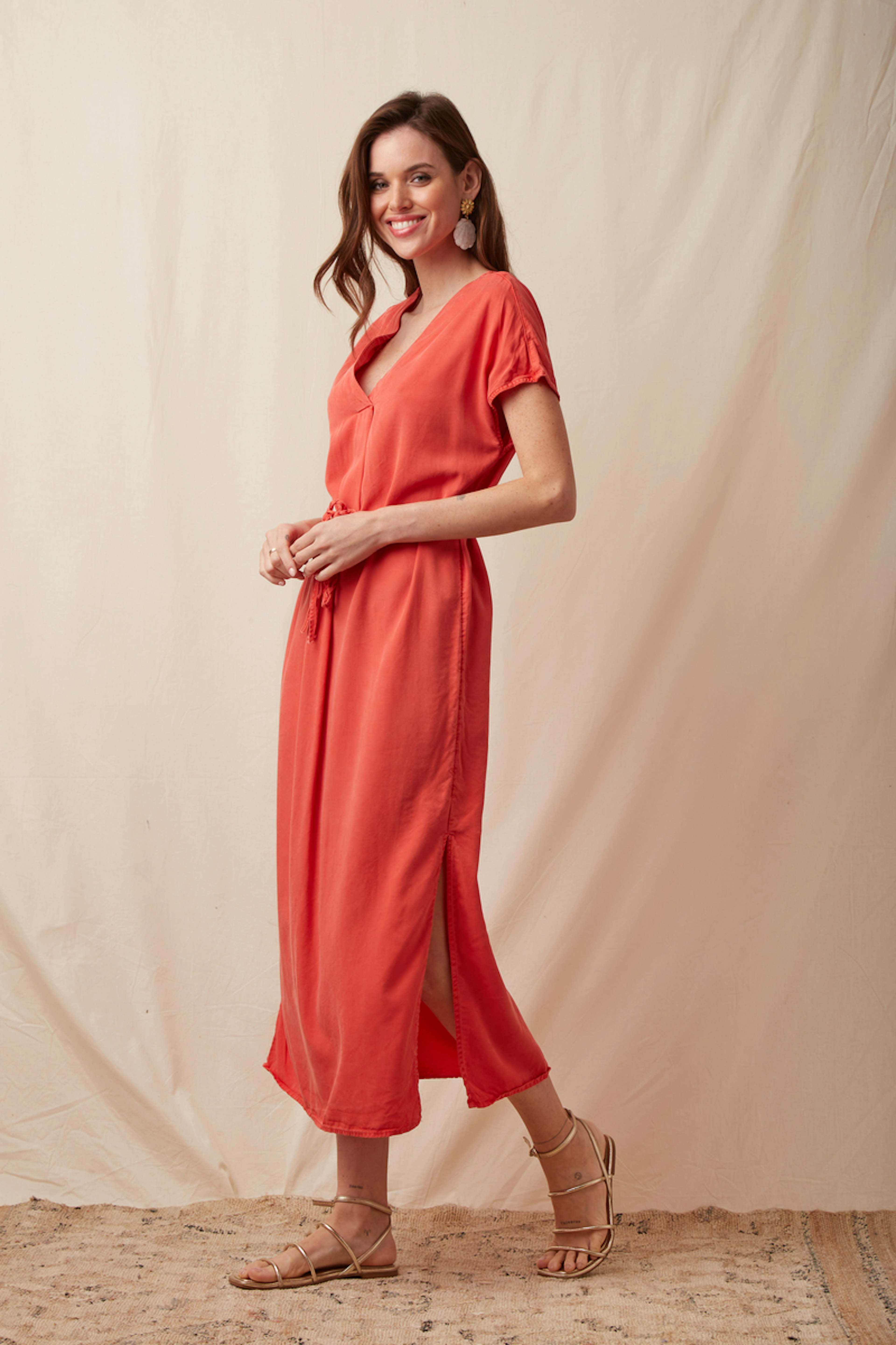 Laissez-vous sรฉduire par cette robe de teinte solaire, parfaite pour toute saison, qui se mariera ร merveille avec des sandales pour un look estival chic ! โข Robe longue en tencel โข Manches courtes volantรฉes โข Encolure en V flatteuse โข Taille cintrรฉe, ceinture assortie โข Fente latรฉrale subtile