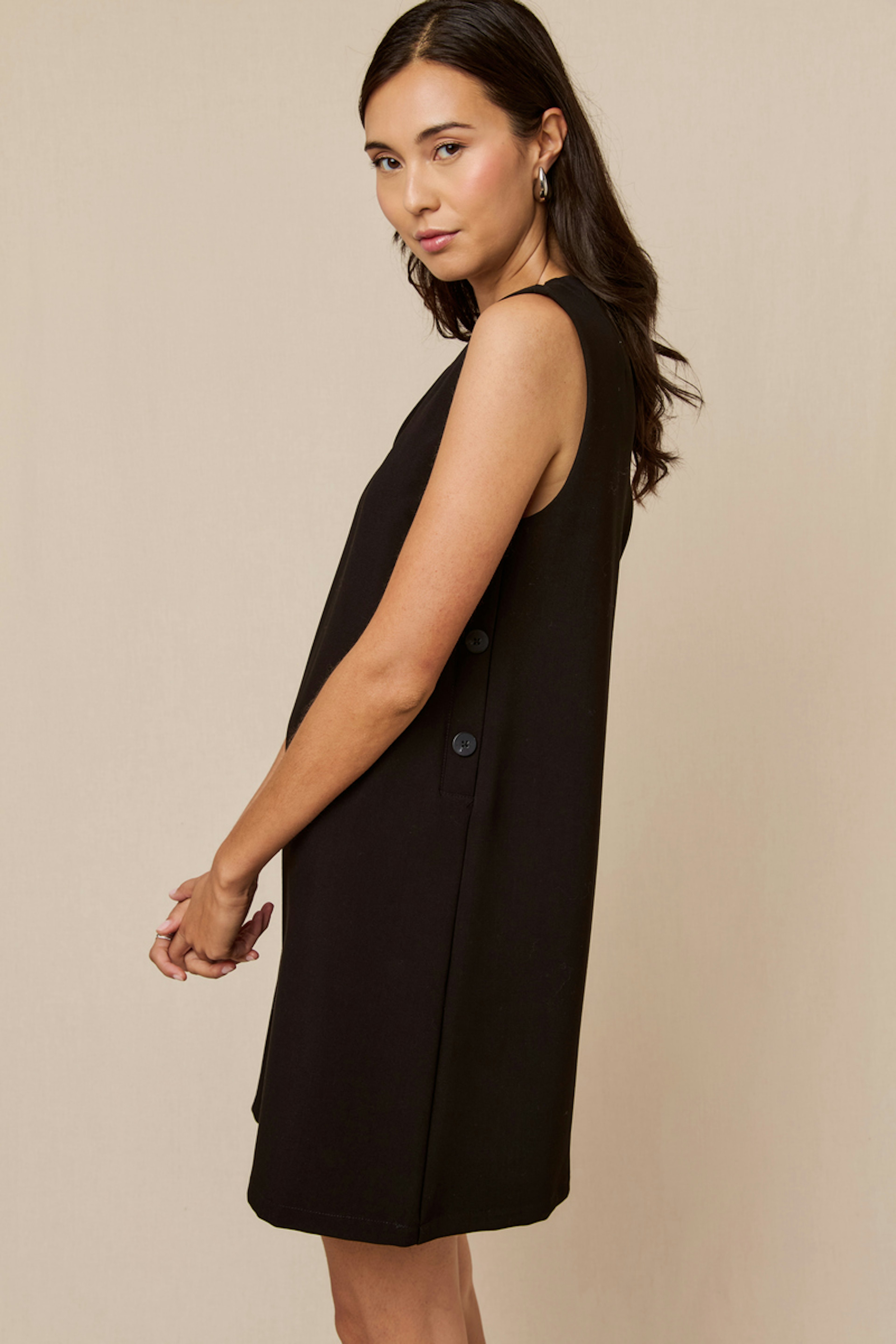 Portez cette robe chic avec des boucles d'oreilles en argent et des escarpins pour un look raffiné et intemporel. Parfaite en toute saison. • Robe courte • Coupe droite • Sans manches • Fermeture à boutons latéraux • Coloris noir élégant