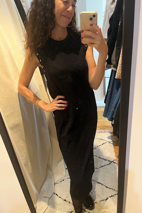 Associez cette élégante robe noire à des escarpins nude et des bijoux dorés pour un look chic parfait en toute saison. • Robe longue • Épaules boutonnées • Sans manches • Encolure ronde • Couleur noire intemporelle