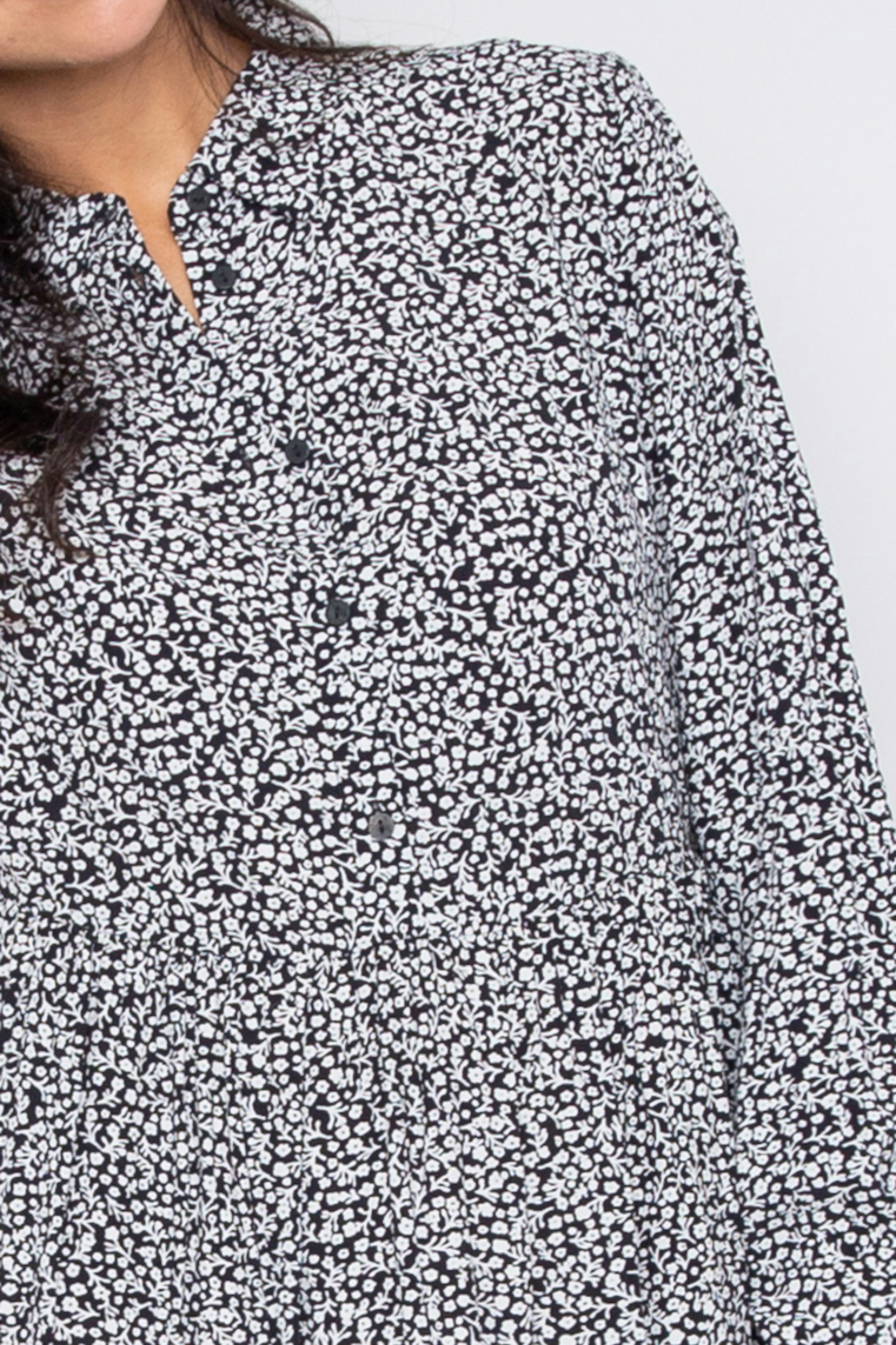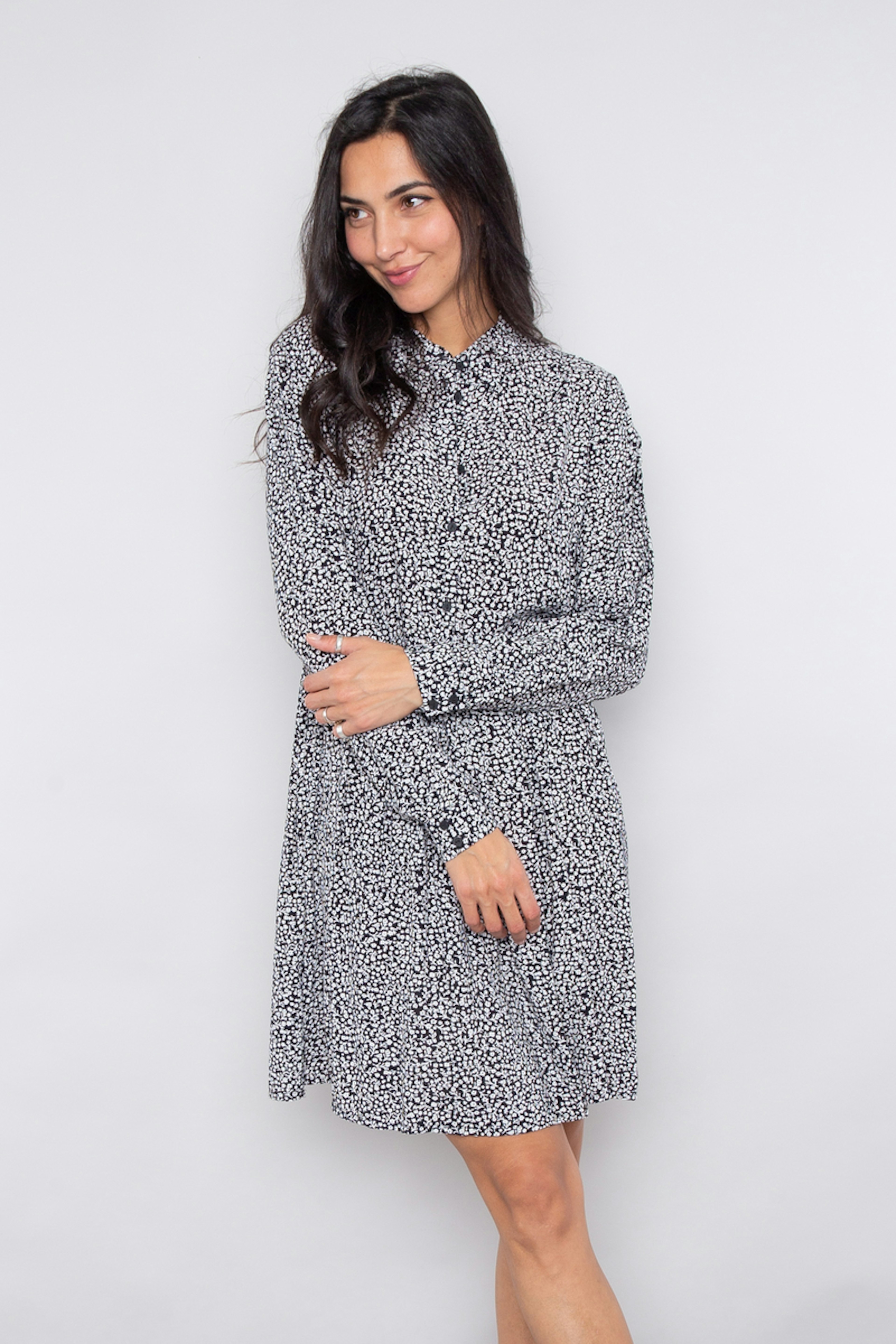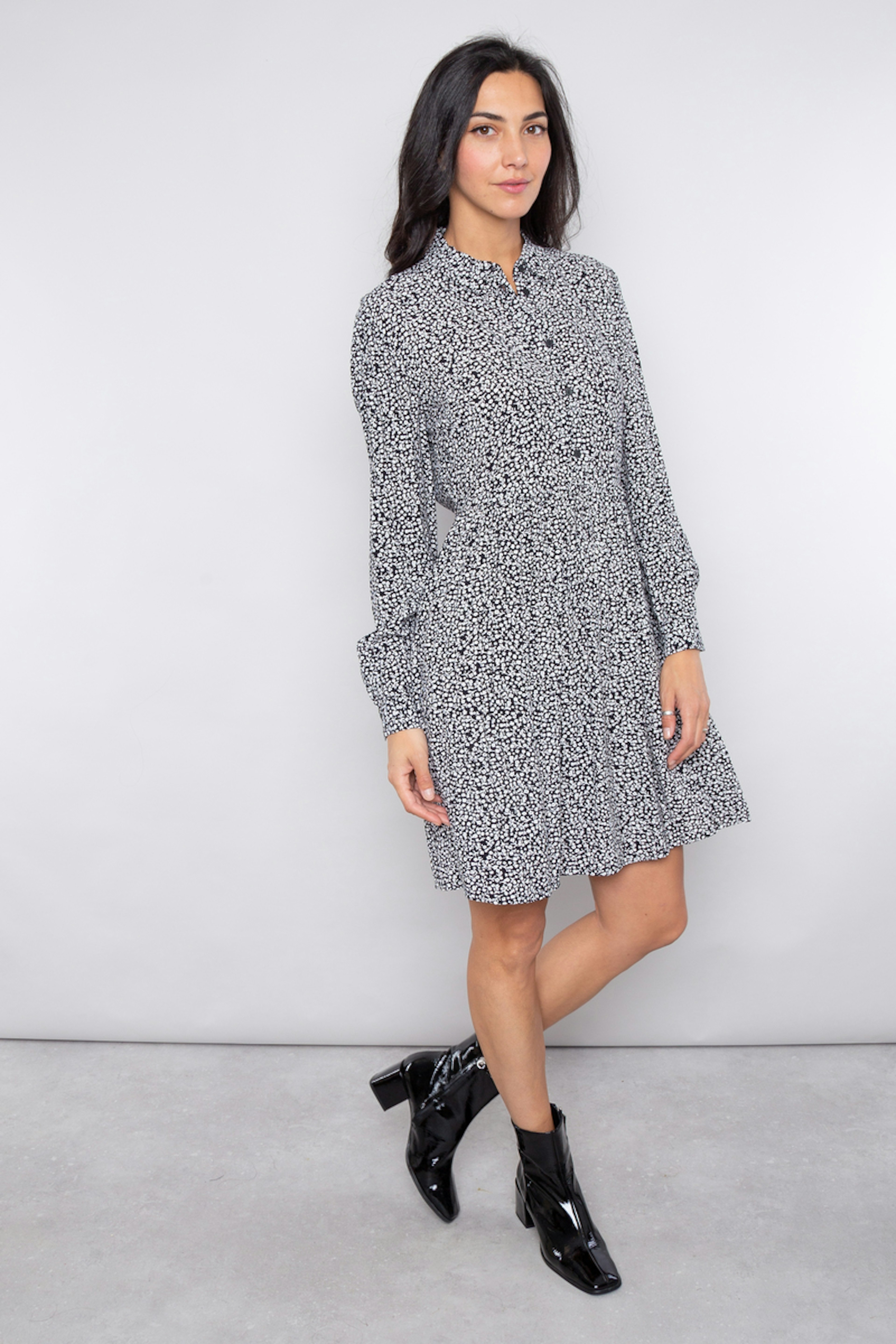 โข Robe chemise ร imprimรฉ blanc sur fond noir โข Col ร revers โข Boutons sur l'encolure โข Manches longues โข Longueur au-dessus du genou