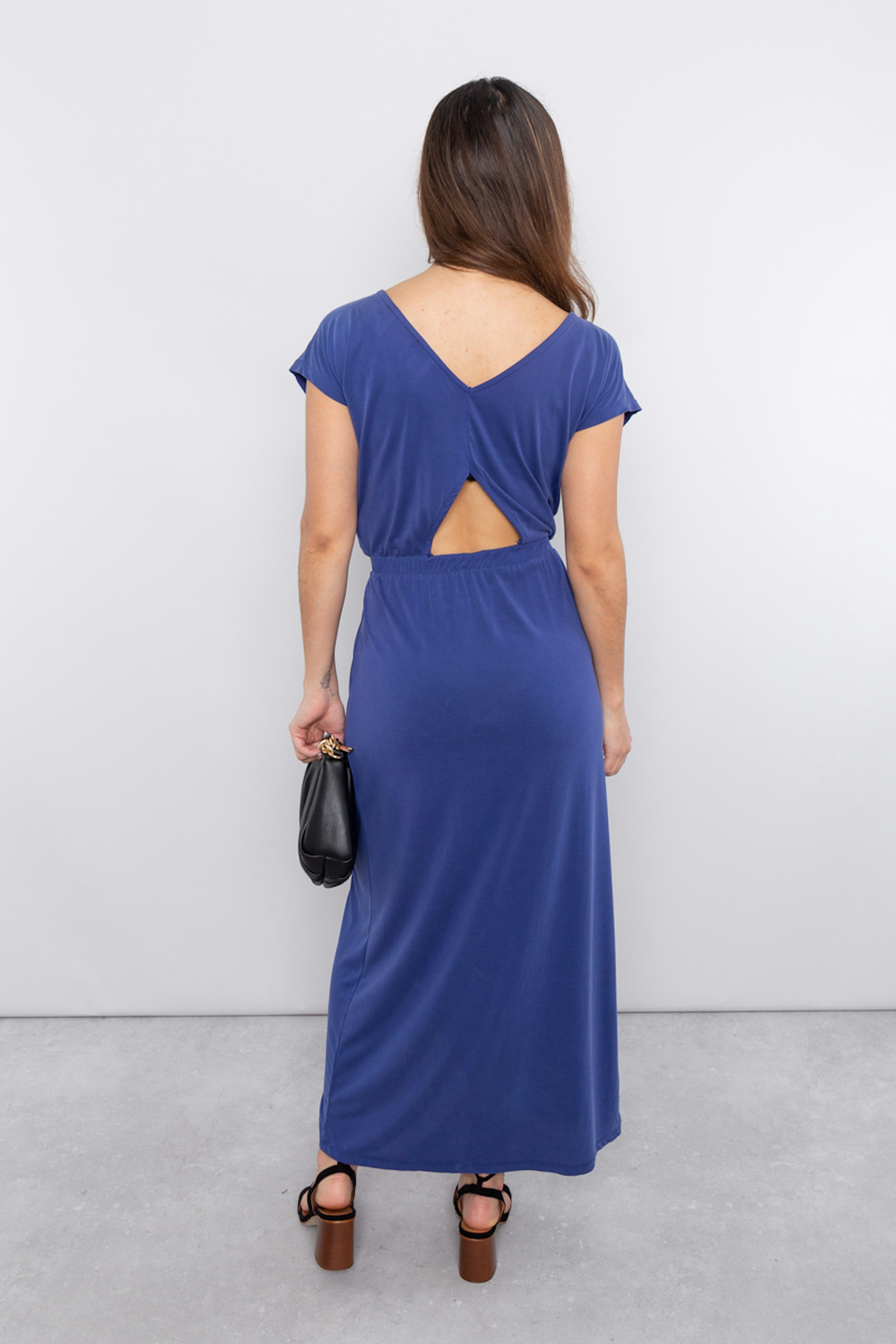 โข Robe longue bleu marine รฉlรฉgante โข Col rond โข Manches courtes โข Taille cintrรฉe รฉlastiquรฉe โข Fente en bas de jupe โข Tissu doux et lรฉger