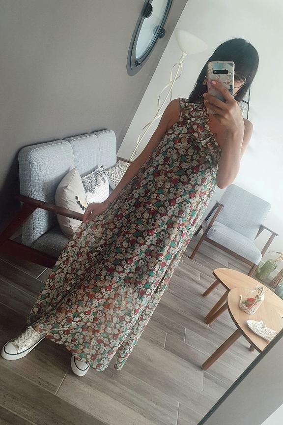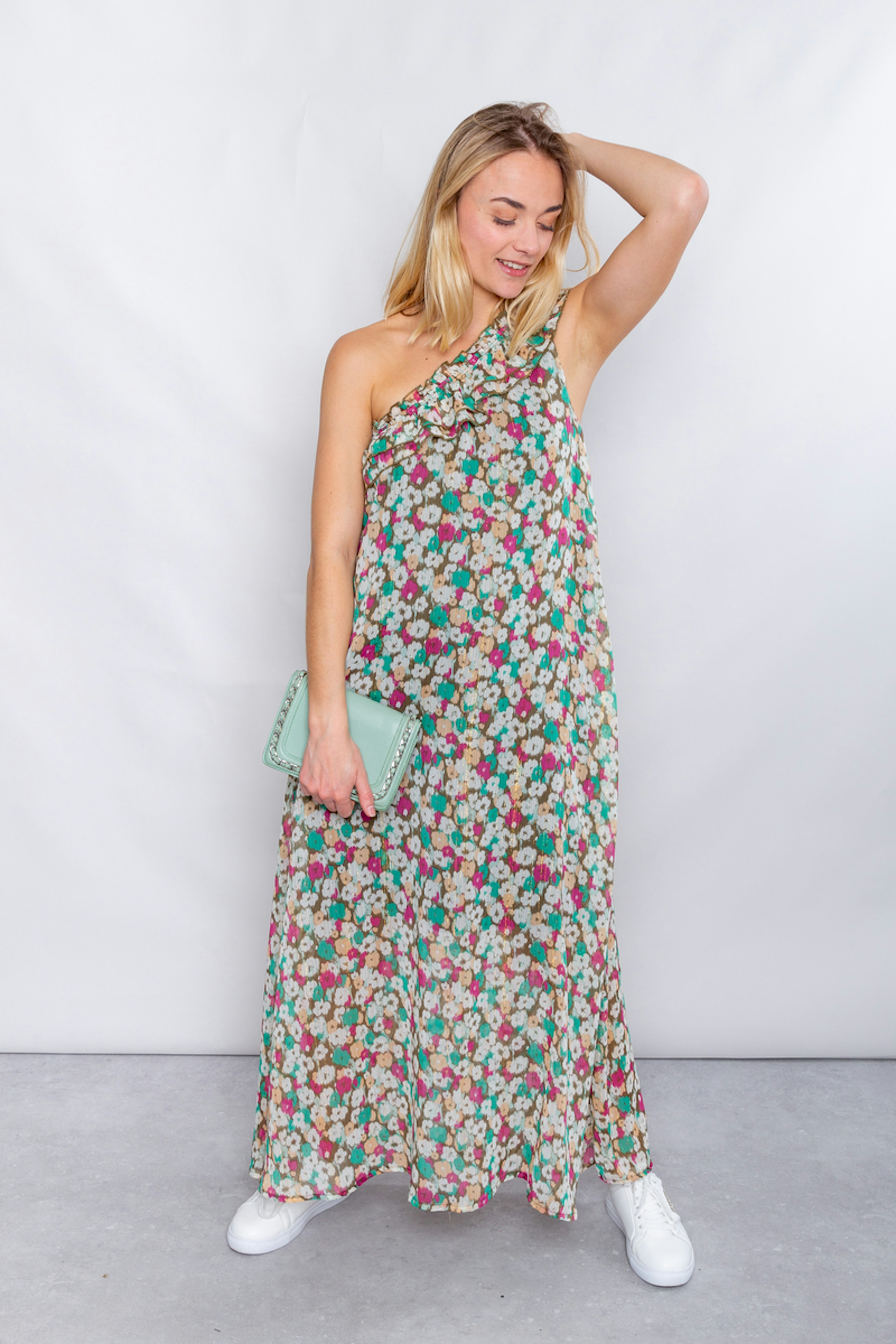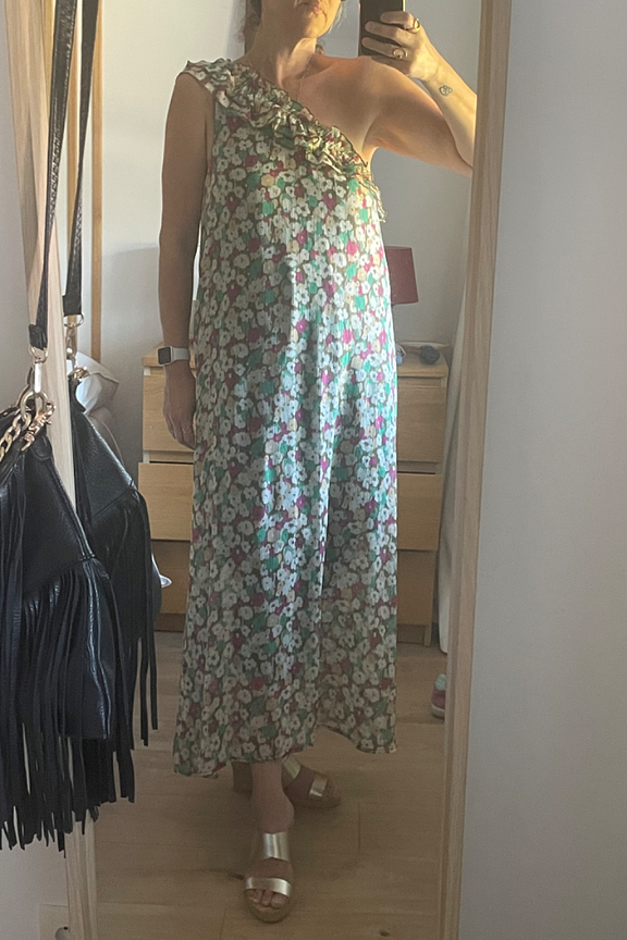 โข Robe longue รฉlรฉgante โข Imprimรฉ fleuri โข Coupe asymรฉtrique avec une รฉpaule dรฉnudรฉe โข Volant sur l'encolure โข Tissu contenant 60% de polyester recyclรฉ
