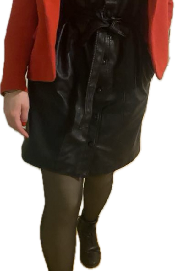 โ€ข Robe courte noire en simili cuir โ€ข Col classique โ€ข Boutonnage sur le devant dissimulรฉ par une patte โ€ข Manches 3/4 โ€ข 2 poches latรฉrales โ€ข Passants et ceinture incluse ร  nouer ร  la taille โ€ข Lignes de coupe surpiquรฉes ร  la taille et ร  la jupe โ€ข Coupe classique โ€ข Composition: 100% Viscose - Polyurethane coated
