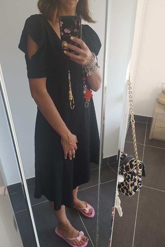 โข Robe noire mi-longue asymรฉtrique โข Dรฉcolletรฉ carrรฉ โข Manches froncรฉes โข Matiรจre texturรฉe