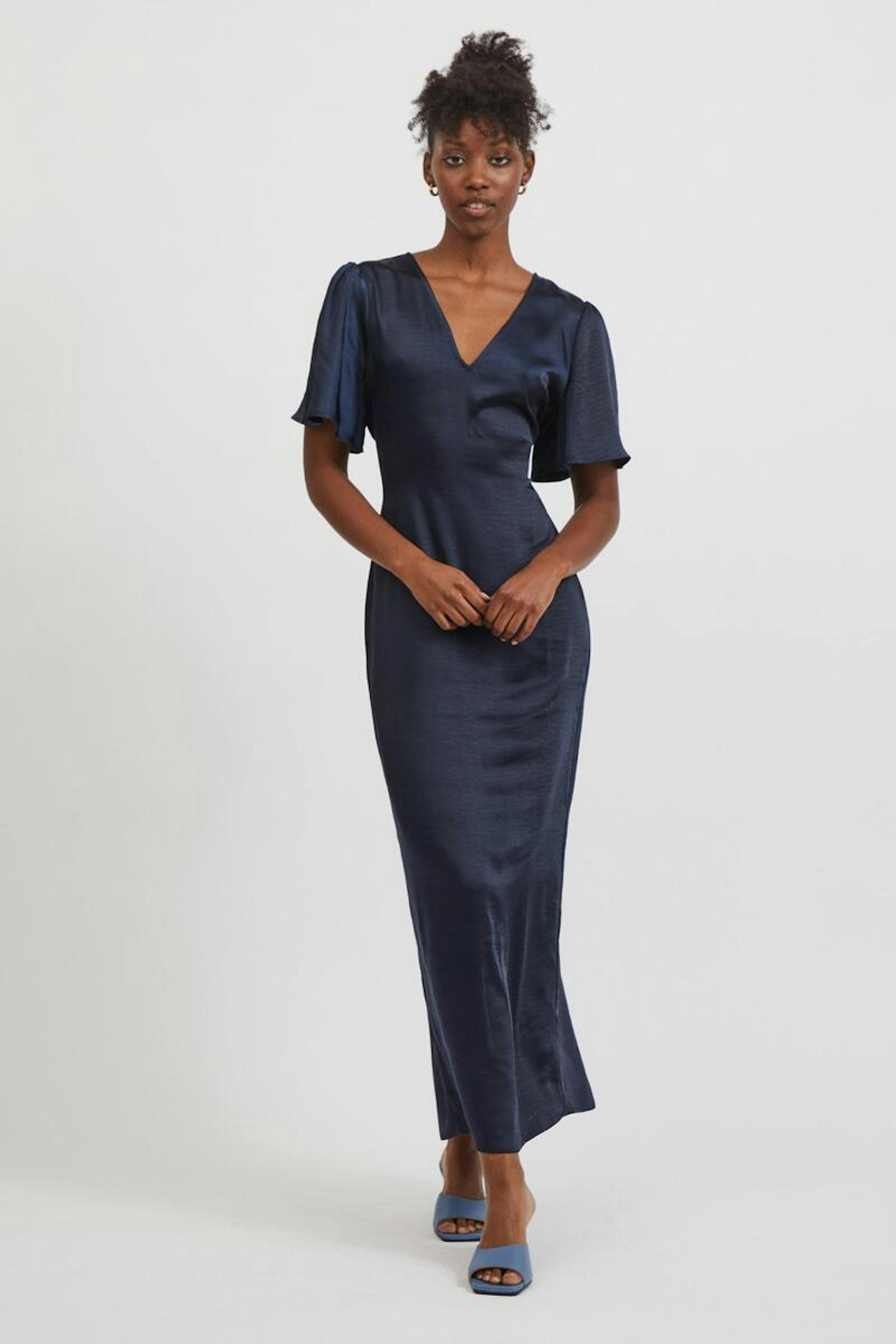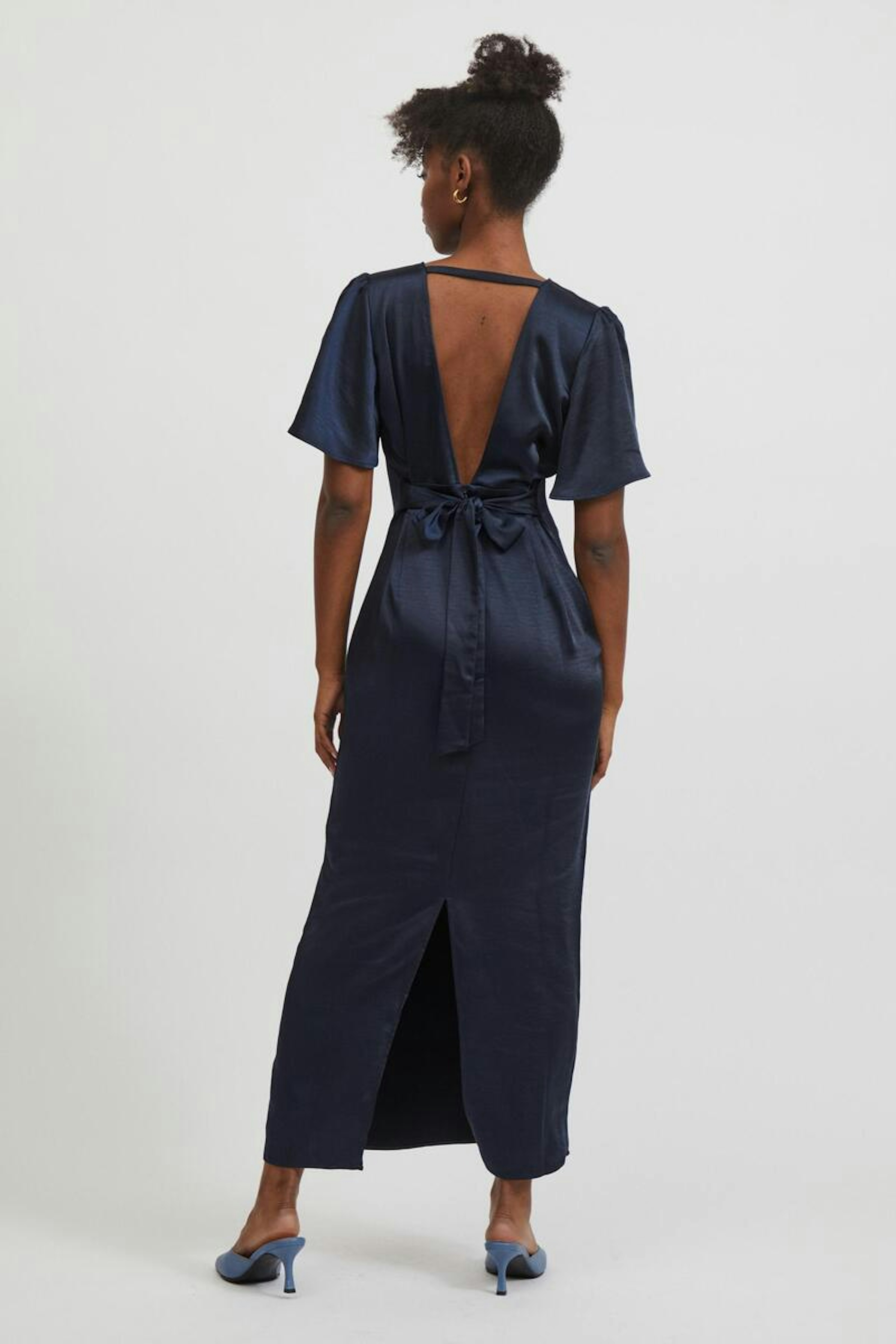 โข Robe รฉlรฉgante bleue marine โข Matiรจre satinรฉe โข Ouverture dans le dos โข Manches courtes fluides โข Taille cintrรฉe ร l'aide d'une ceinture