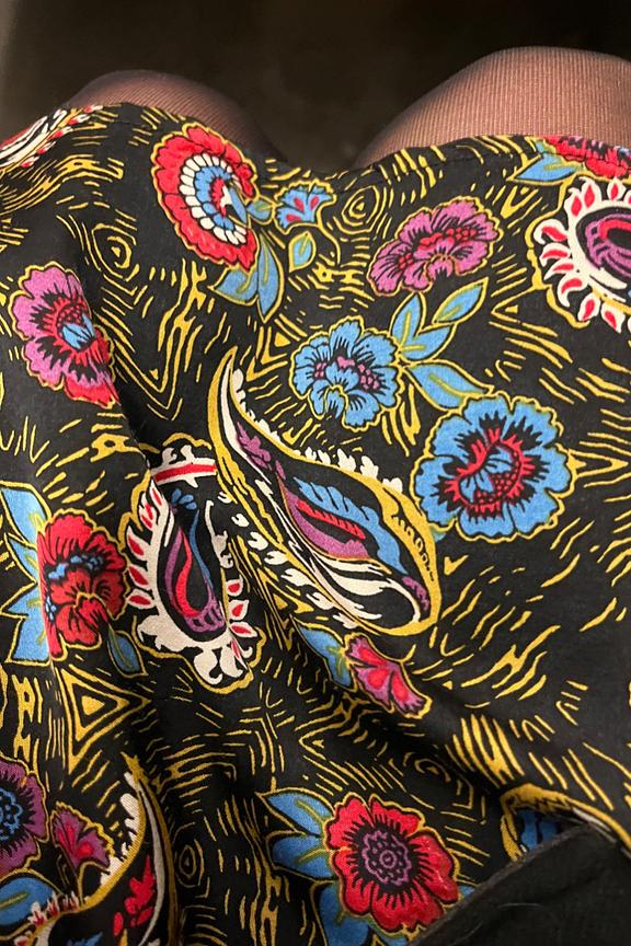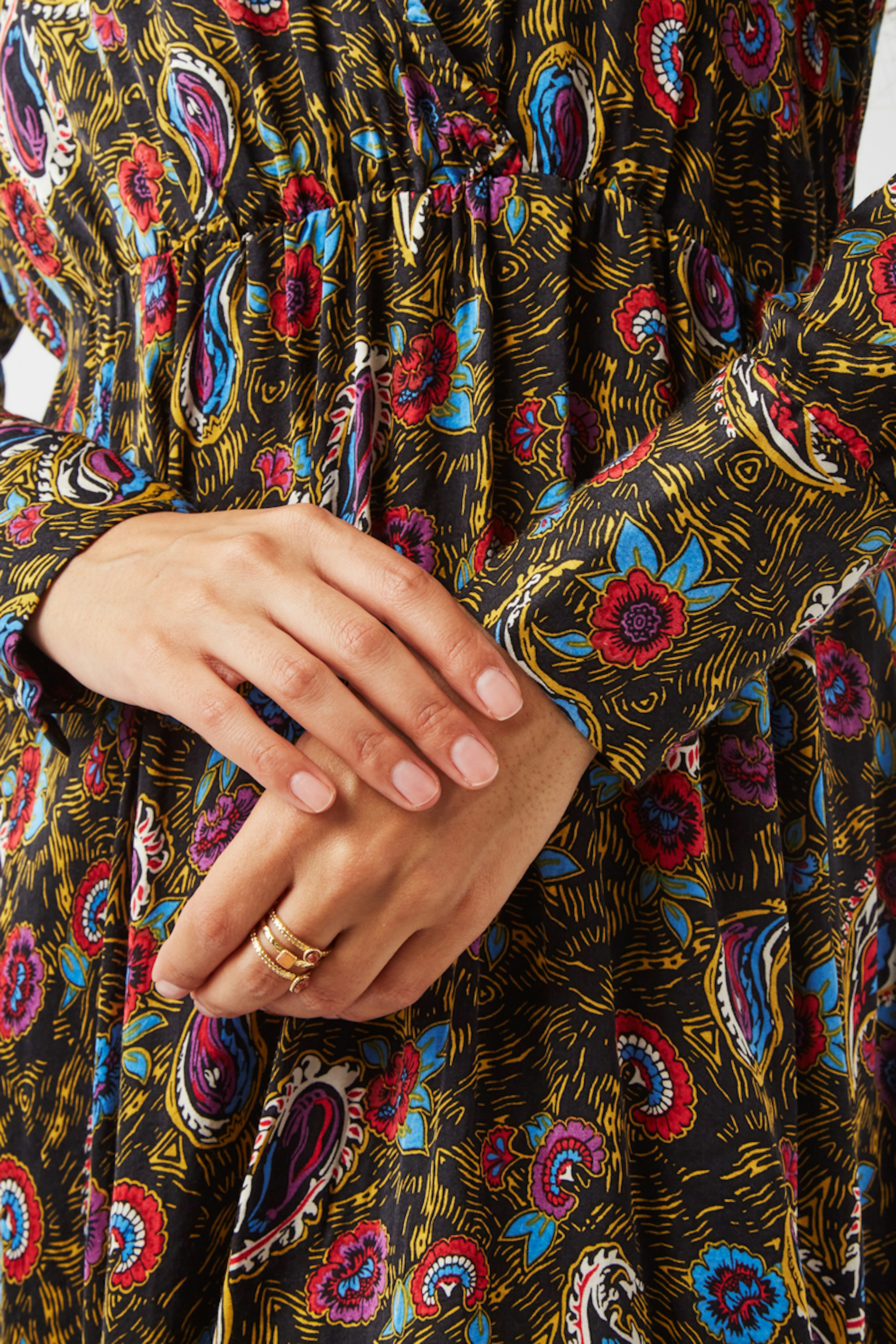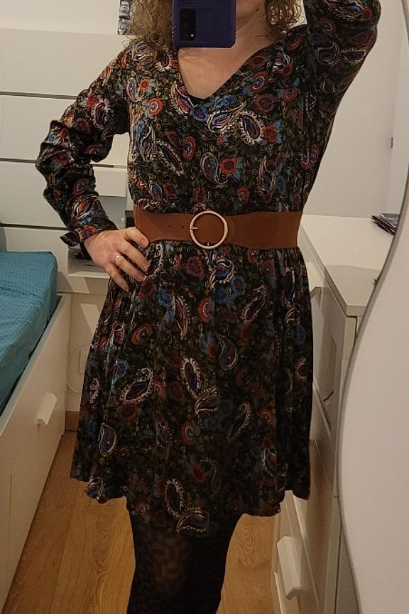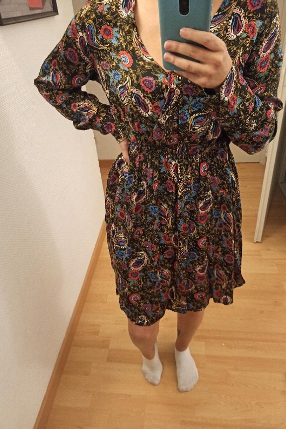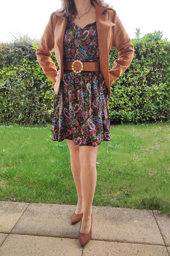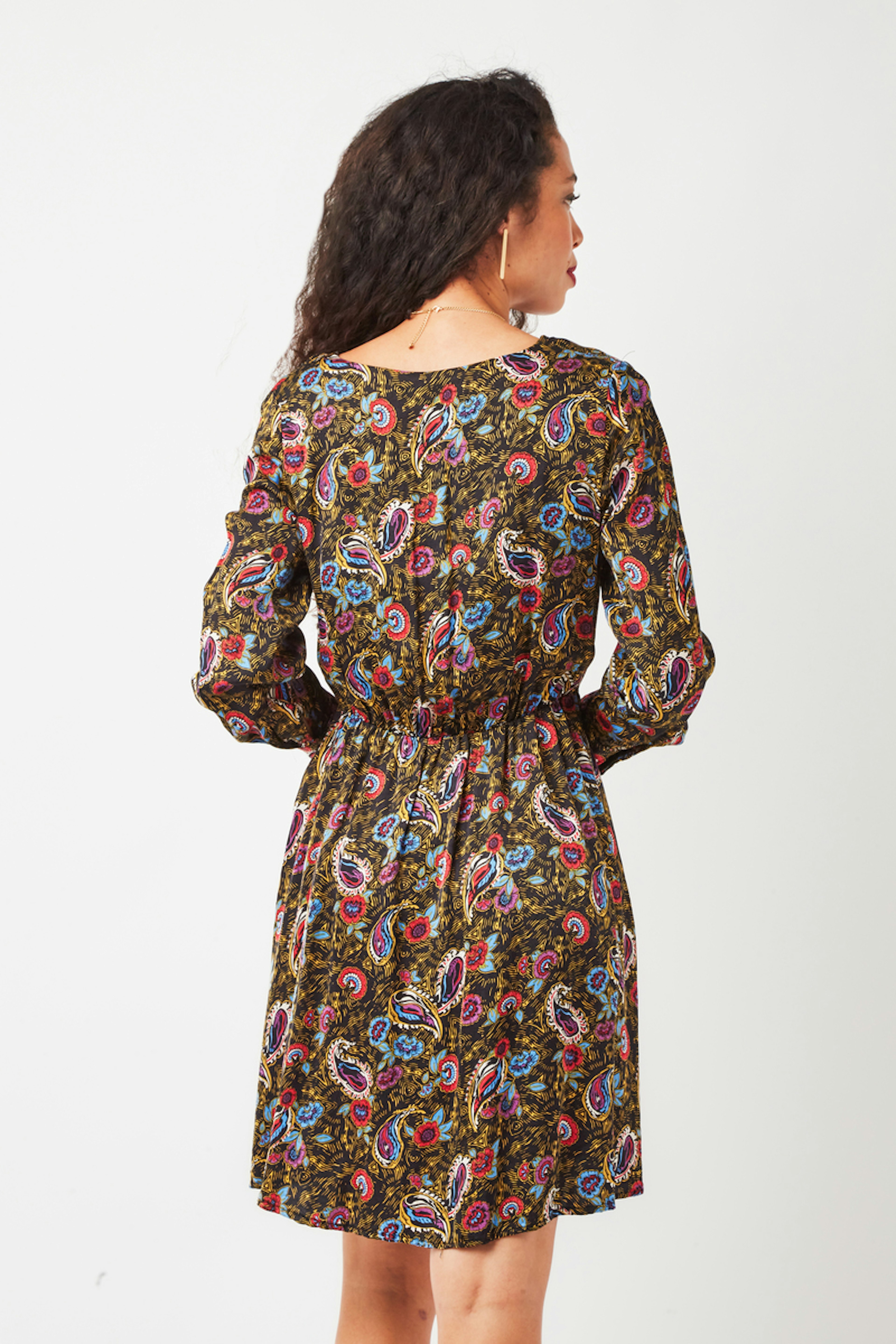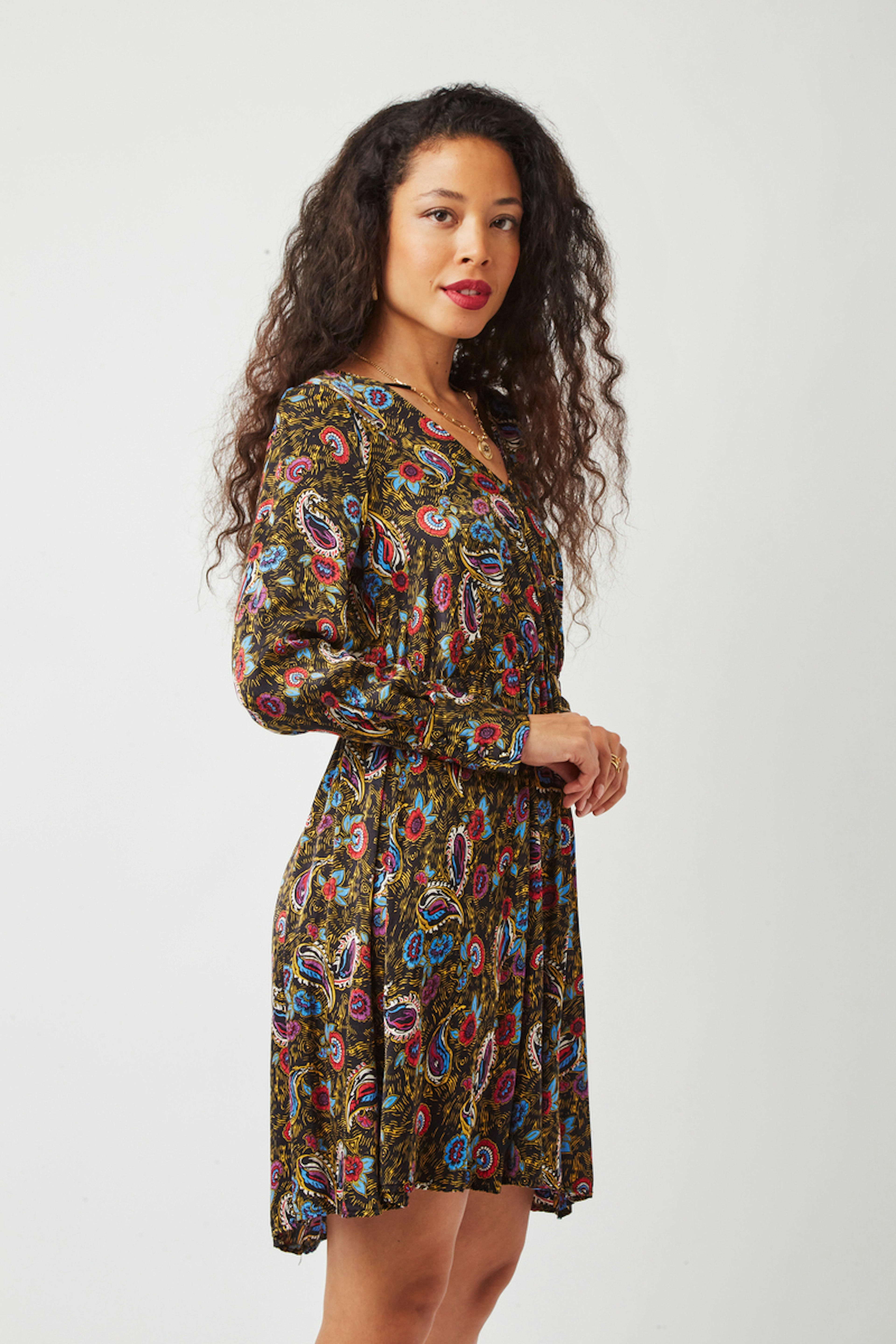 โข Robe courte ร manches longues โข Imprimรฉ colorรฉ sur fond marron โข Tissu fluide en viscose โข Taille cintrรฉe โข Col V