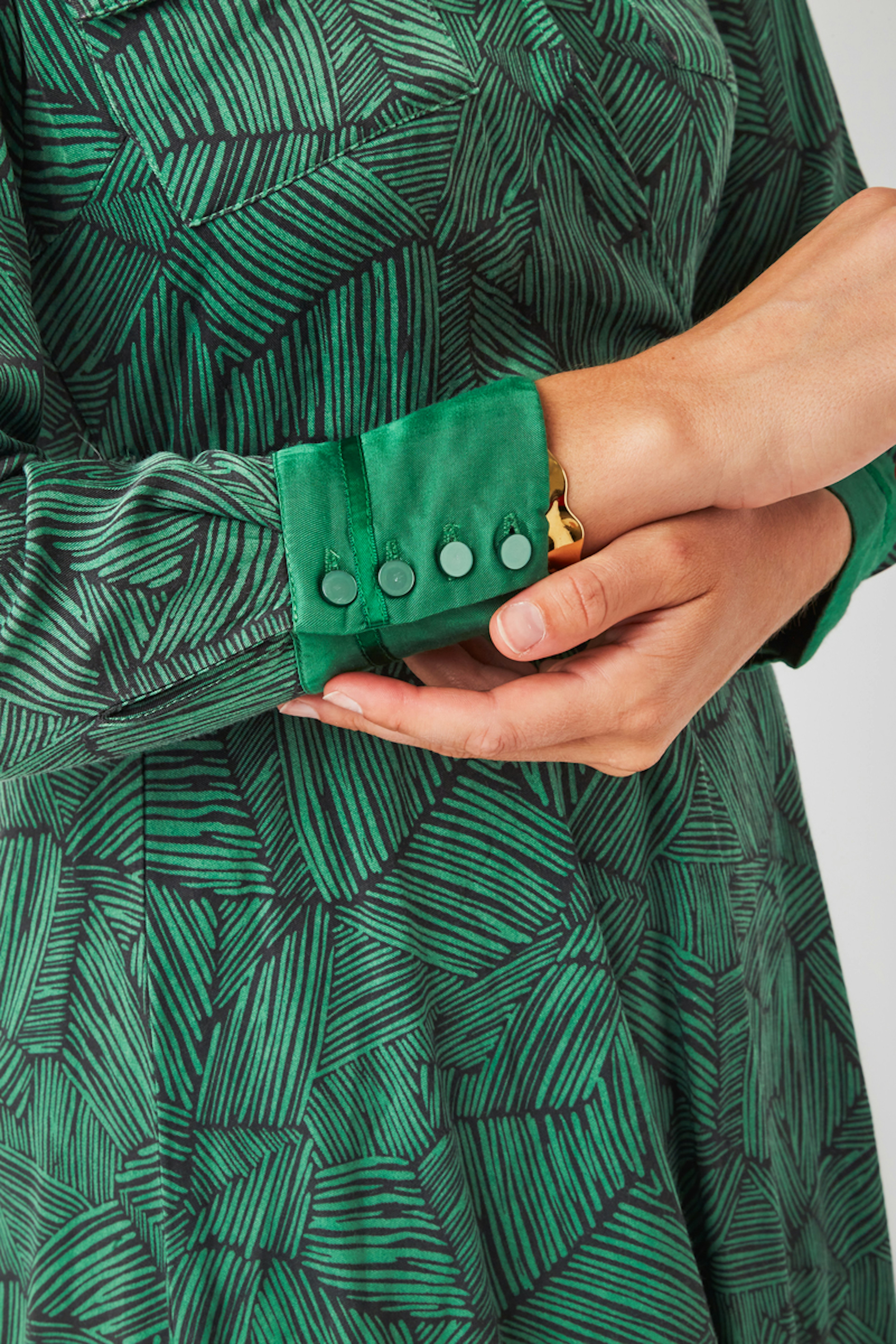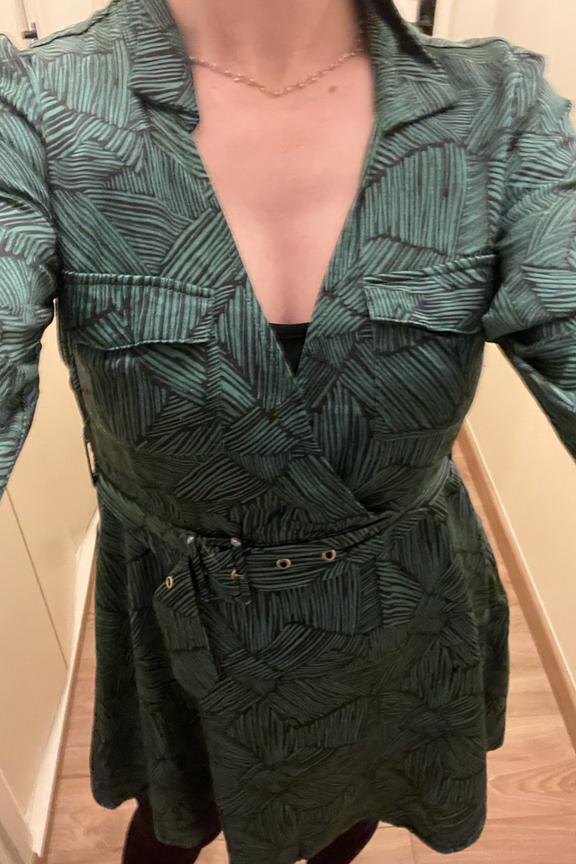 โข Robe verte ร manches longues courte coupe portefeuille โข Tissu satinรฉ avec dรฉtails โข Taille cintrรฉe ร l'aide d'une ceinture dans le tissu