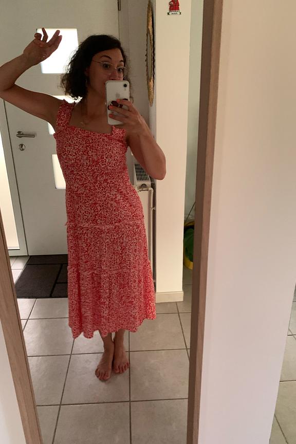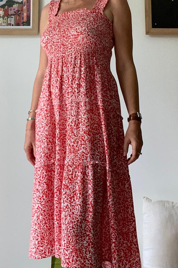 โข Robe longue rouge ร imprimรฉ fleuri โข Bretelles โข Smocks ร la poitrine โข Taille cintrรฉe โข Volants en bas de jupe โข Tissu en viscose certifiรฉe รฉcovero