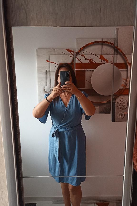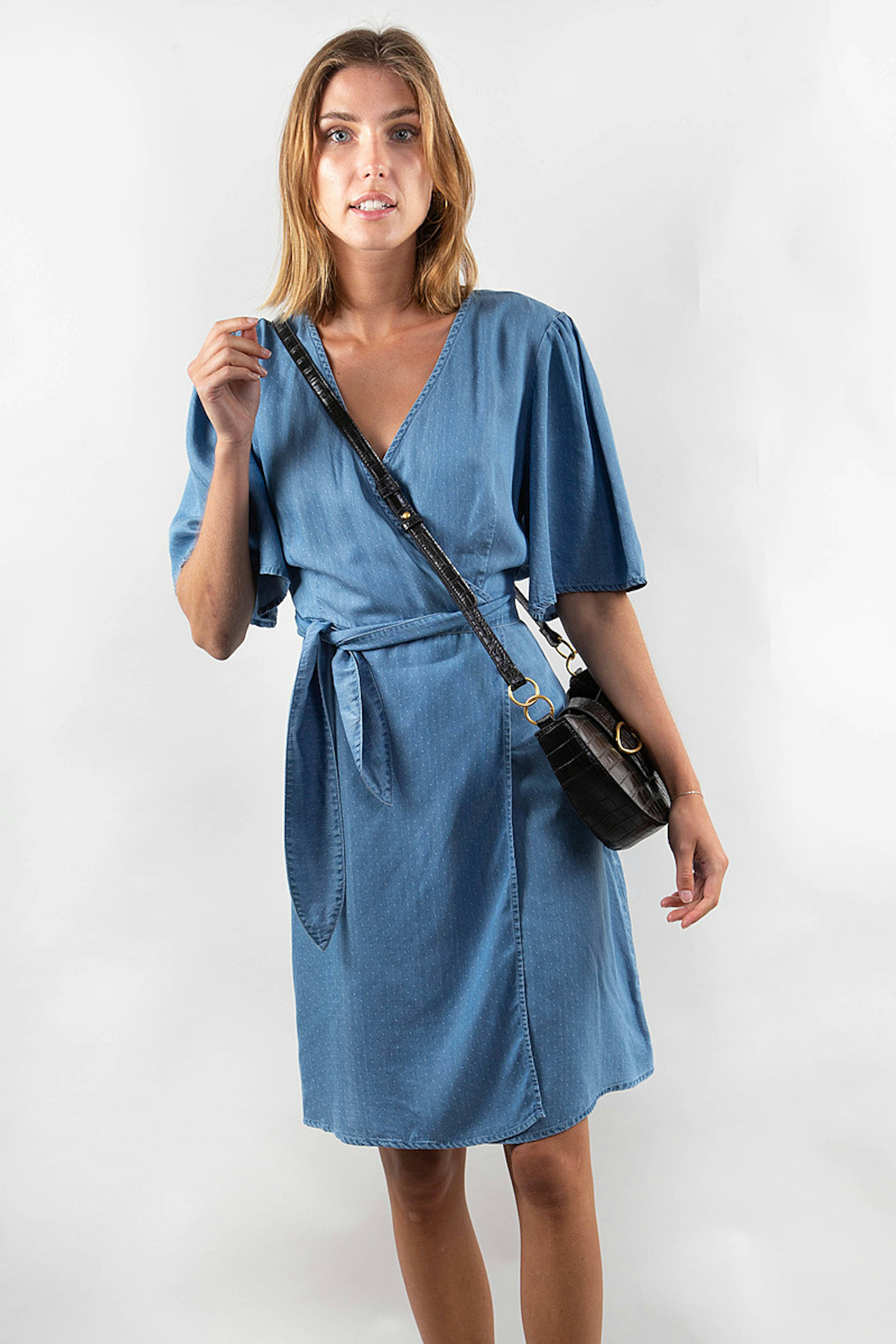 โข Robe courte en Tencel โข Dรฉcolletรฉ en V croisรฉ โข Manches courtes รฉvasรฉe โข Taille cintrรฉe avec ceinture ร nouer โข Longueur au-dessus du genou