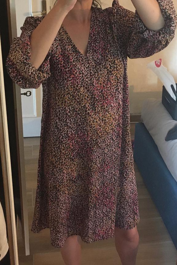 โข Robe courte ร imprimรฉs abstraits rose et jaune โข Encolure en V โข Manches longues finition lรฉgรจrement ballon aux poignets โข Taille cintrรฉe par une ceinture en tissu ร nouer