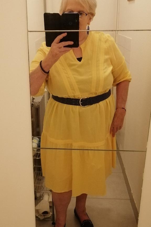 โข Robe courte jaune โข Coupe รฉvasรฉe โข Col V โข Manches mi-longues โข Volant en bas de jupe