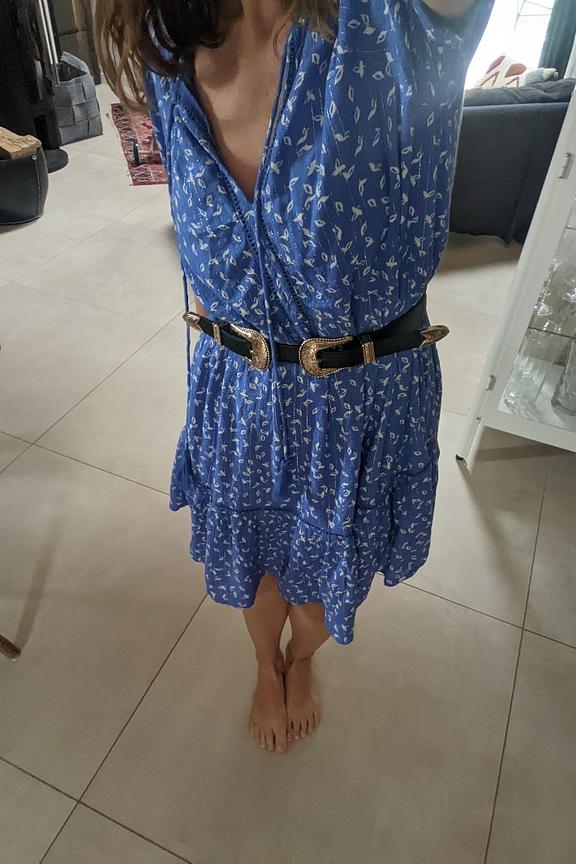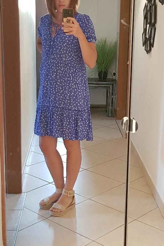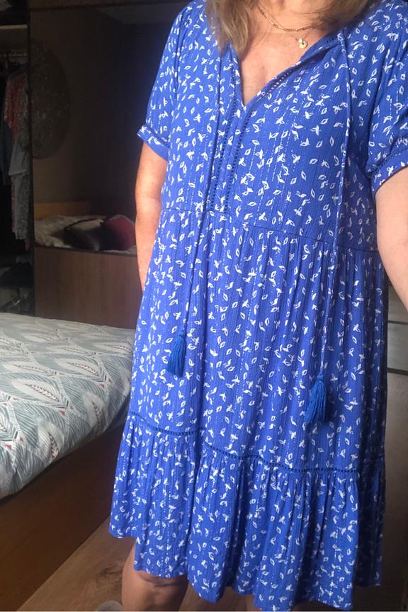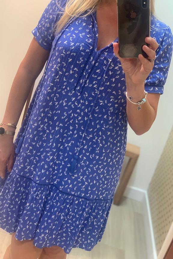 โข Robe courte bleu รฉlectrique imprimรฉe โข Coupe รฉvasรฉe โข Manches courtes โข Col V avec lien ร nouer