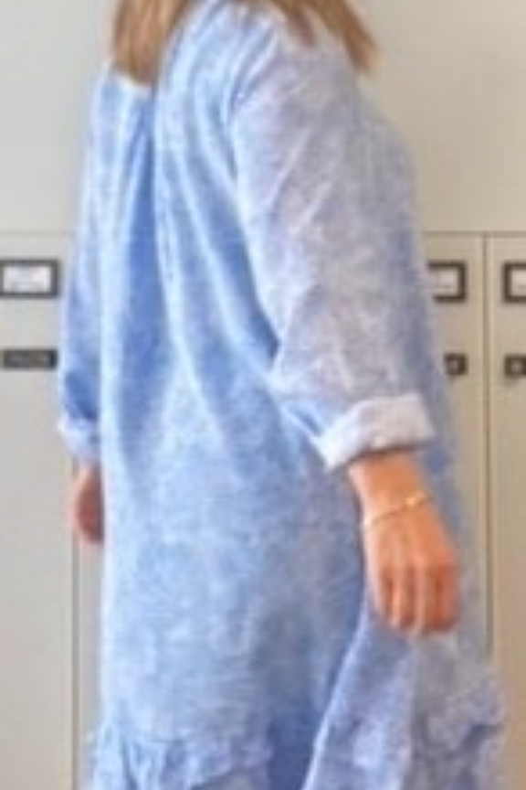 โข Robe ร imprimรฉ โข Coloris bleu ciel โข Encolure en V avec lien ร nouer au niveau du cou โข Manches 3/4 avec lien ร nouer de chaque cรดtรฉ โข Coupe รฉvasรฉe avec volants sur le jupon โข Longueur au-dessus du genou