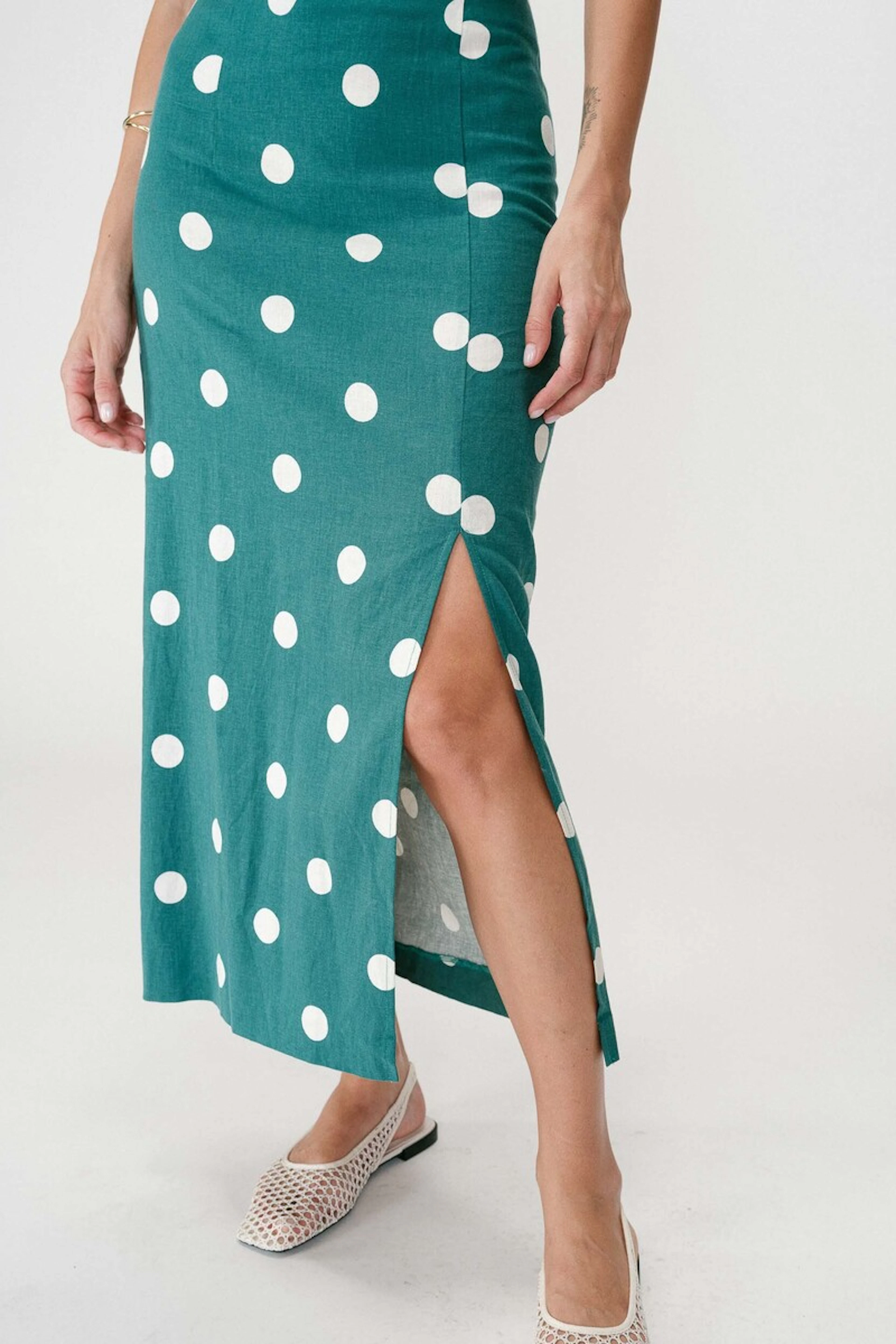 Associez cette robe séduisante à des sandales en cuir blanc et un chapeau de paille pour un look estival chic. • Robe en lin et viscose • Décolleté licou flatteur • Dos nu élégant • Longueur midi • Motif à pois blancs